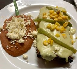 230 gr. Pastel de elote con queso manchego, bañado en crema de chile verde, acompañado de frijolitos.