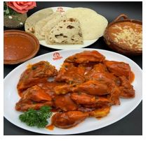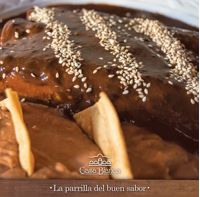 120 gr. 3 piezas. Tortilla de maíz rellenas de pechuga de pollo, bañada en mole de la casa, acompañada de frijolitos.
