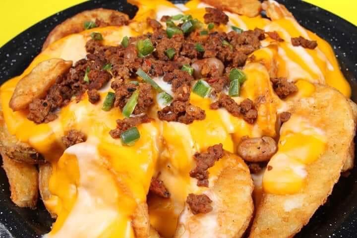 Deliciosas papas a la francesa 300 gr. en queso amarillo, con trocitos de tocino y chile jalapeño.