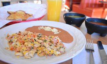 Dos huevos revueltos con tomate, cebolla, tomate, cilantro y chile verde, acompañados de frijoles