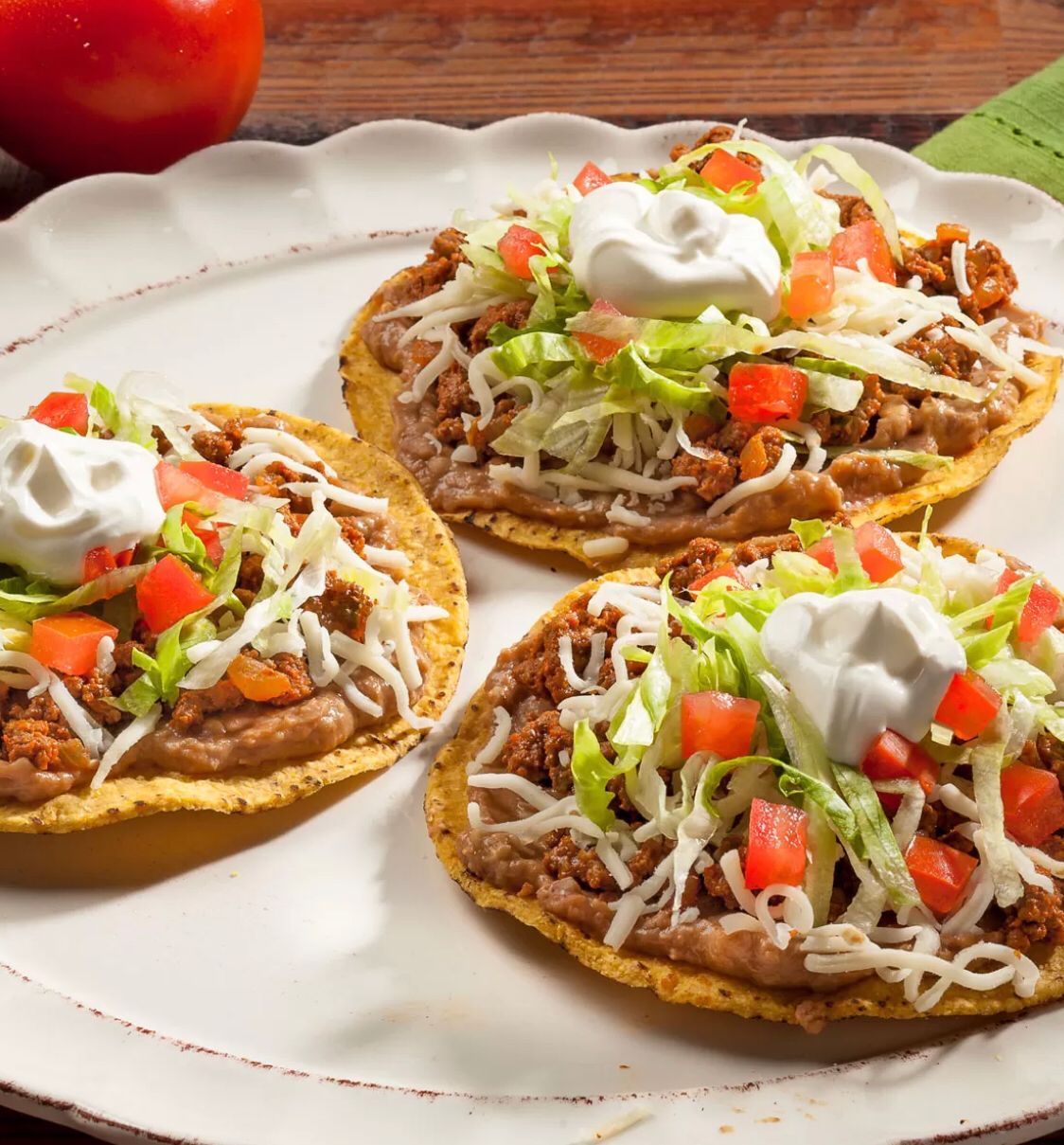 Orden de 3 tostadas de carne con papa o pollo con papa, servida con lechuga, queso fresco y tomate.