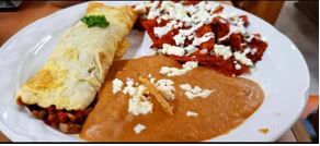 Omelette relleno al gusto con 2 ingredientes a elegir (jamon, tocino, champiñon, pimiento, espinaca, pimiento, chile verde), acompañado de chilaquiles regionales y frijolitos.