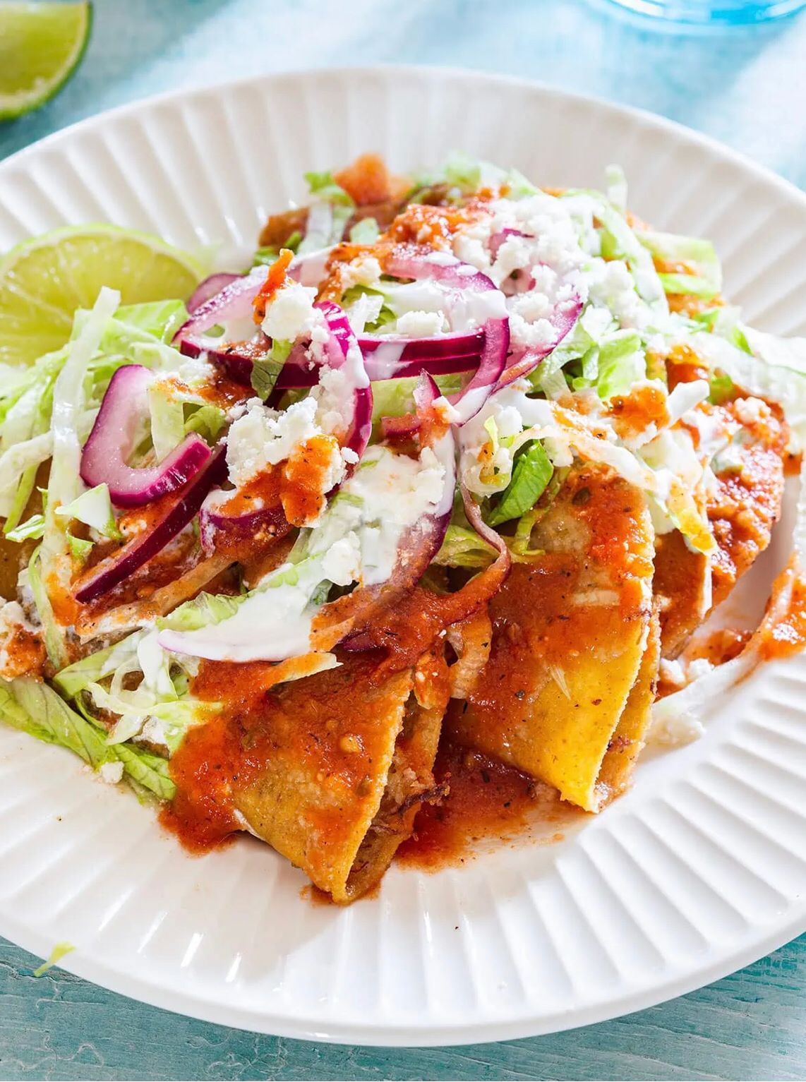 120 gr. 3 piezas. Tortilla de maíz rellenas de pechuga de pollo, bañada en salsa de chile colorado, con queso fresco, cebolla y cilantro, con un toque de crema, acompañada de frijolitos.
