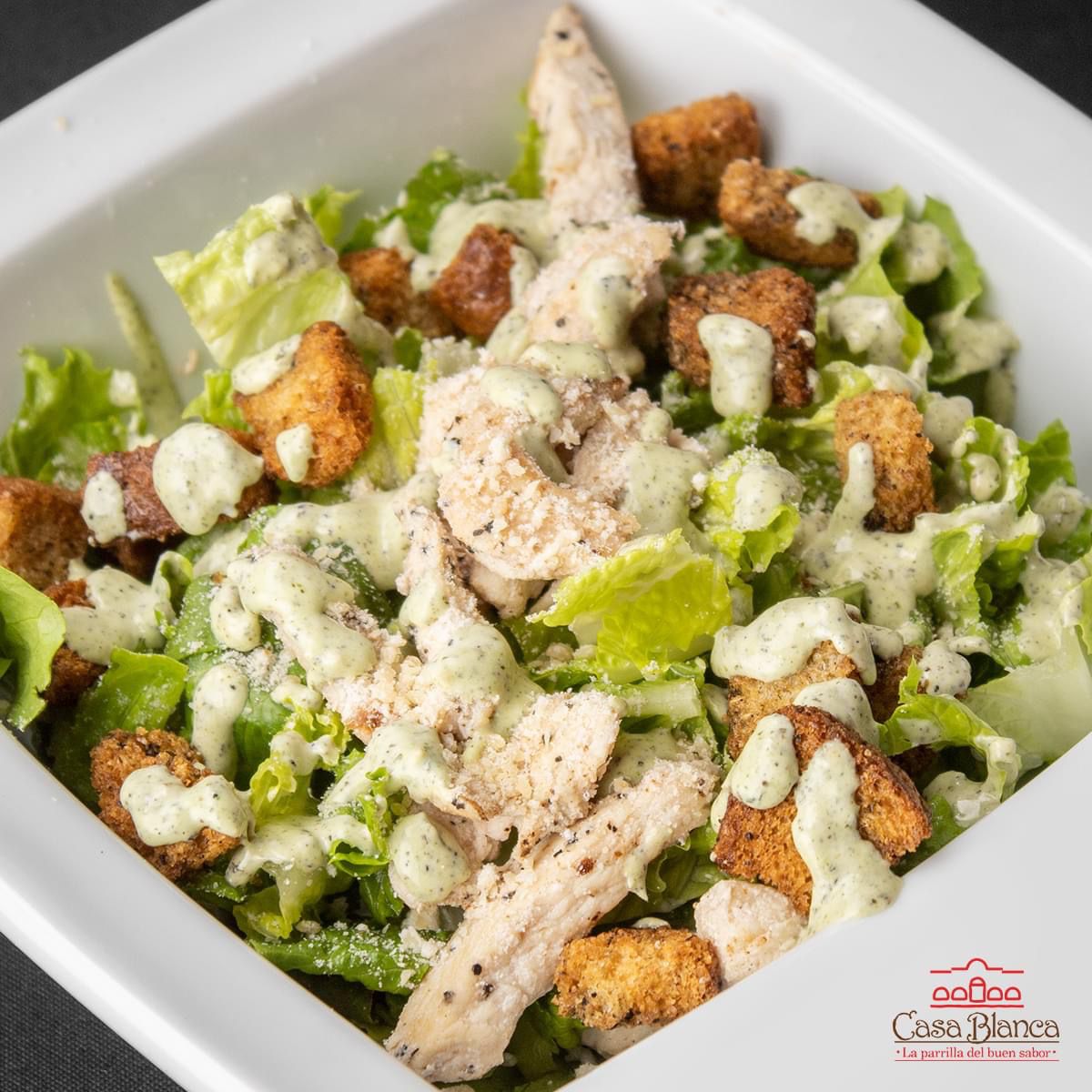 La tradicional con lechuga orejona, queso parmesano, pechuga de pollo a la parrilla, crotones y aderezo cesar.