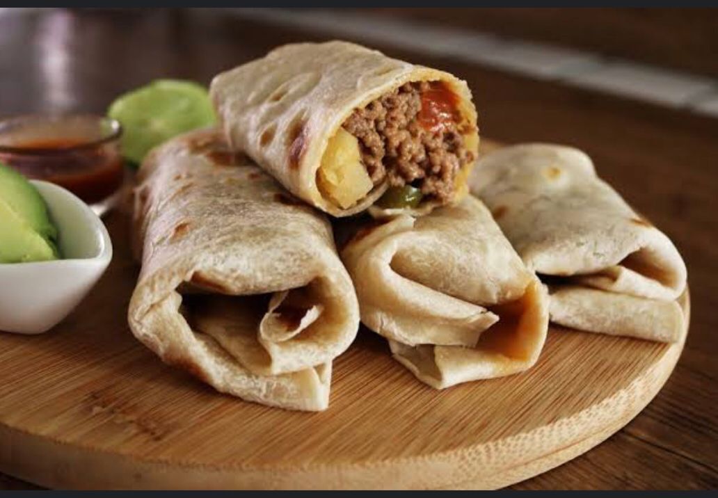 Chimichanga en tortilla sobaquera, rellena de carne con papa, pollo con papa o rajas con queso, servida con lechuga, tomate y queso fresco y crema