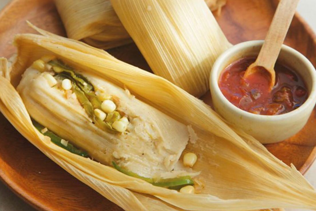 Orden de 3 tamalitos de elote con chile verde, acompañados de frijolitos