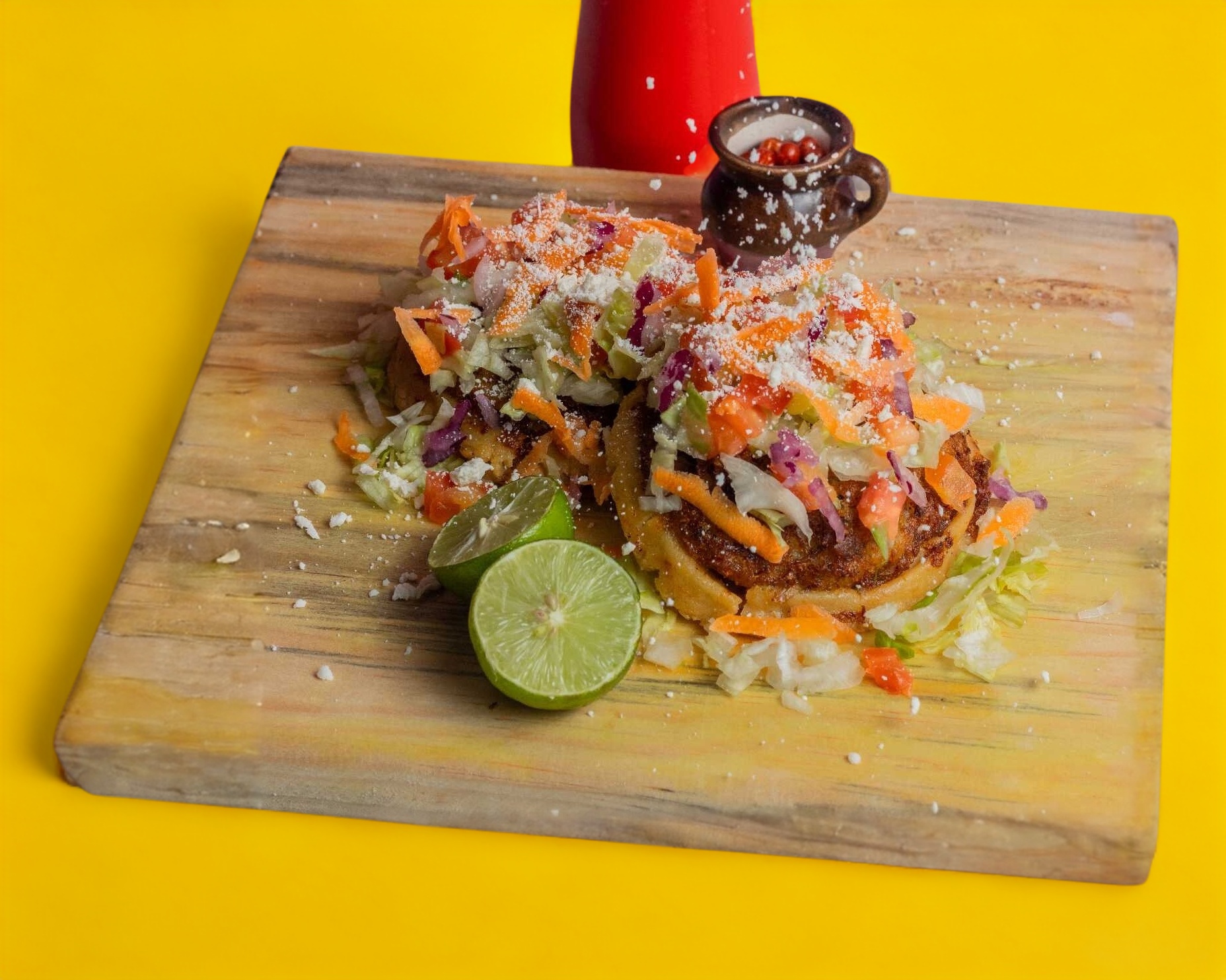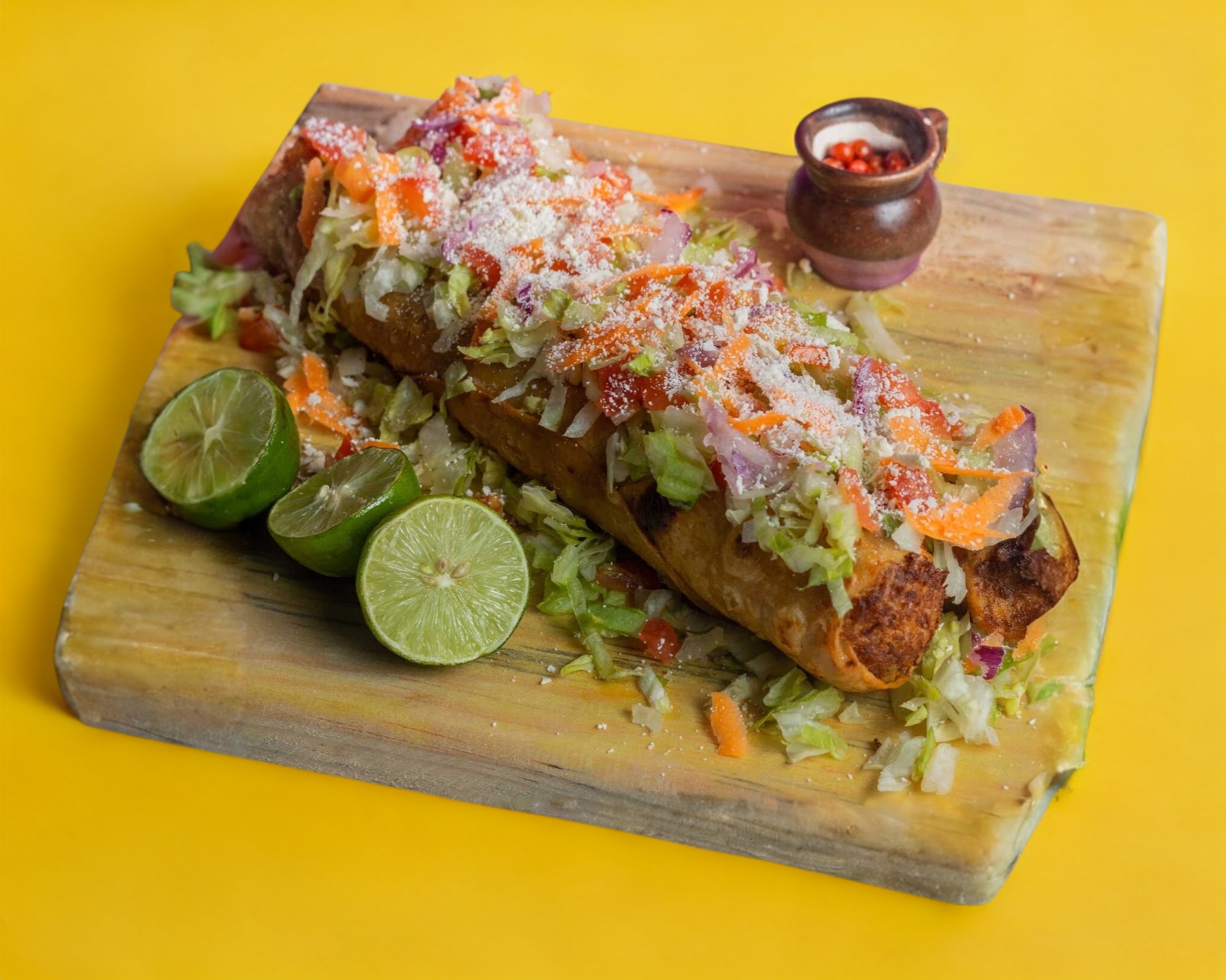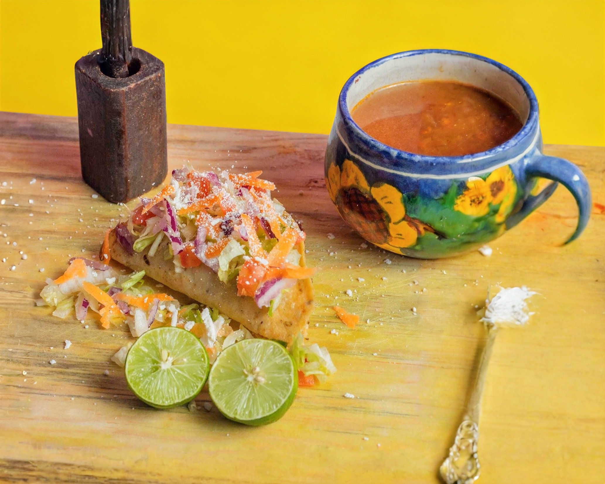 Taco dorado de papa con carne deshebrada, lechuga, tomate, cebolla morada, zanahoria y queso. Acompañada de consomé, medica crema, limón y salsa.