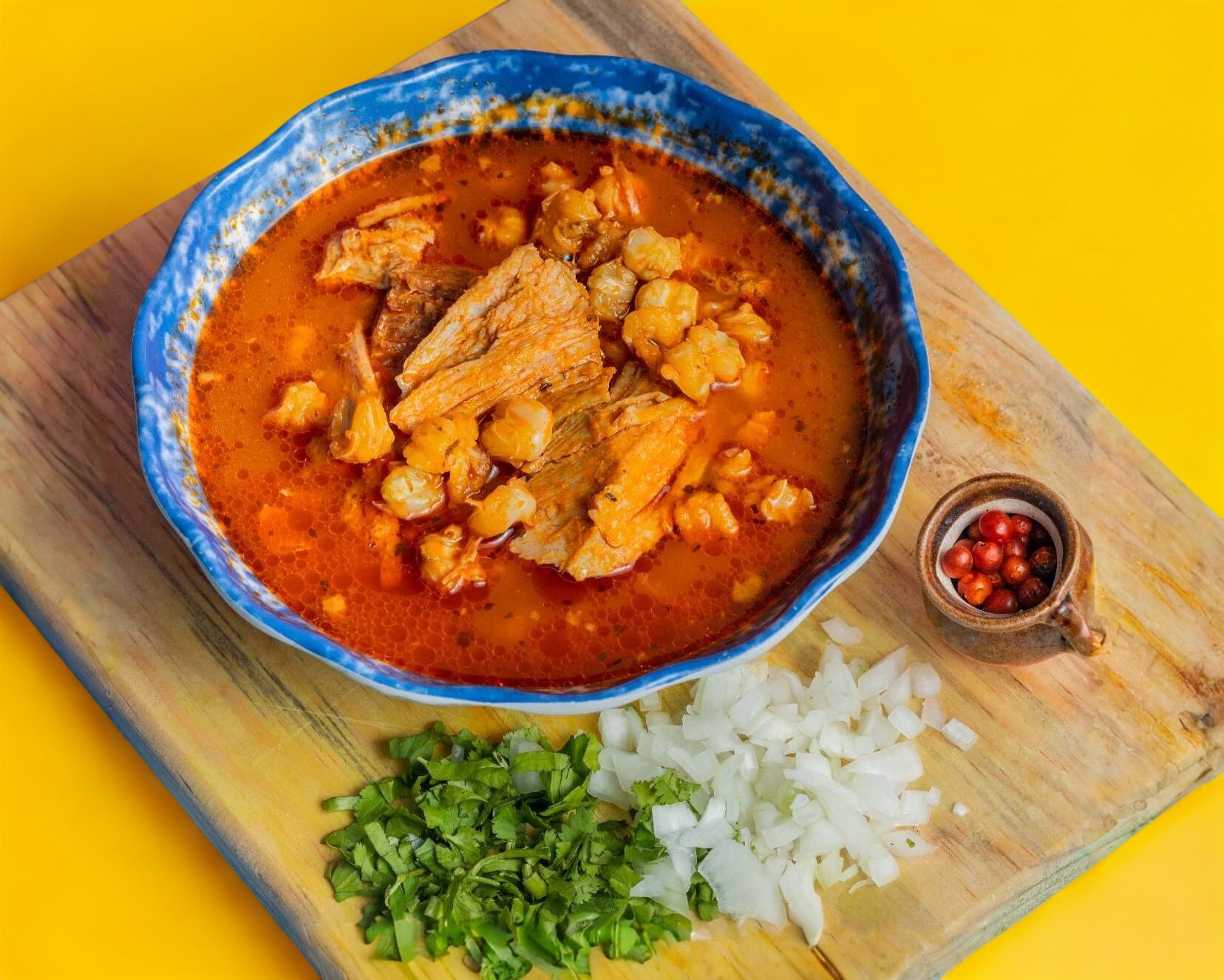 1 litro de pozole rojo de pierna de puerco acompañado con cilantro, cebolla blanca, limon, totopós y chiltepin.