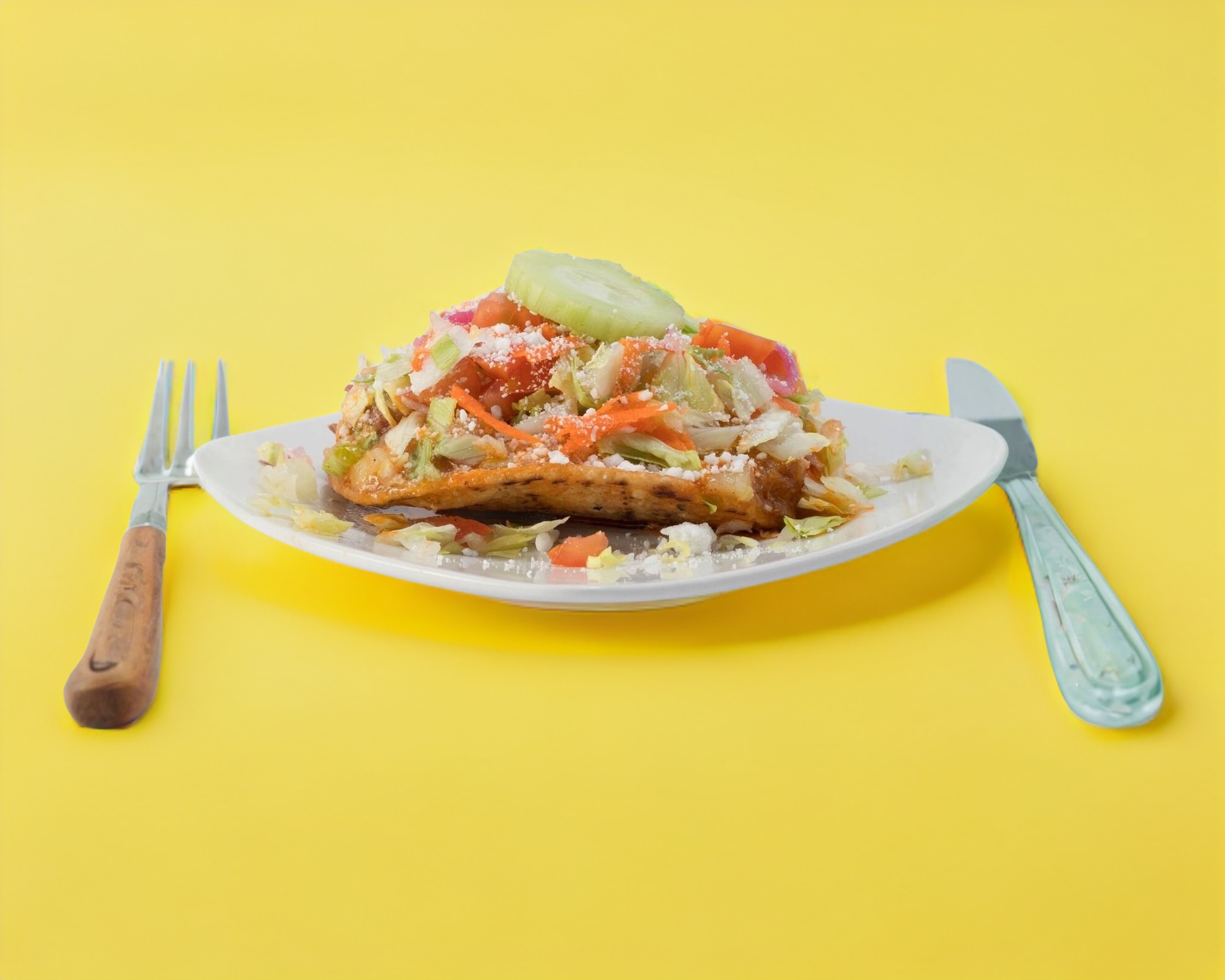 Tostada de maíz con papa y carne deshebrada con lechuga, tomate, cebolla morada, zanahoria y queso. Acompañada de crema y salsa.
