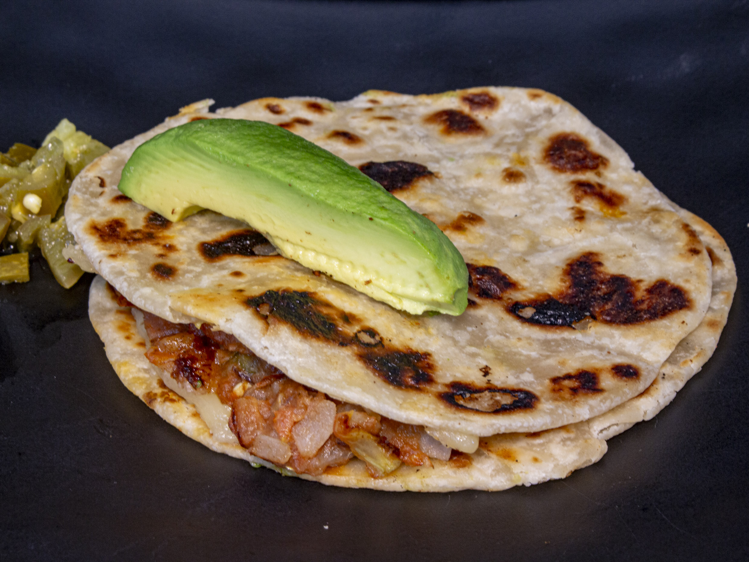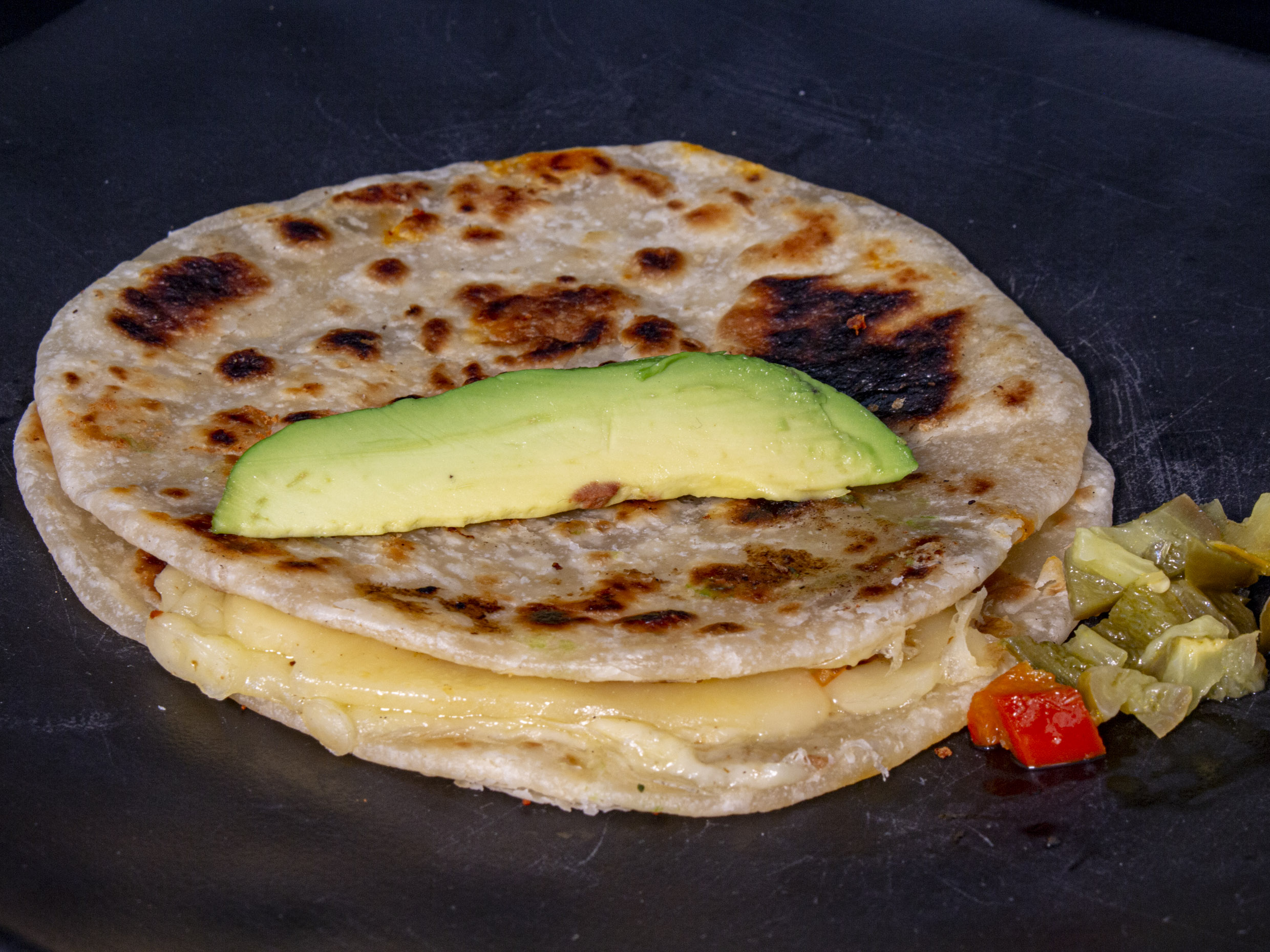 Dos tortillas de harina con queso menonita, aguacate y salsa roja.