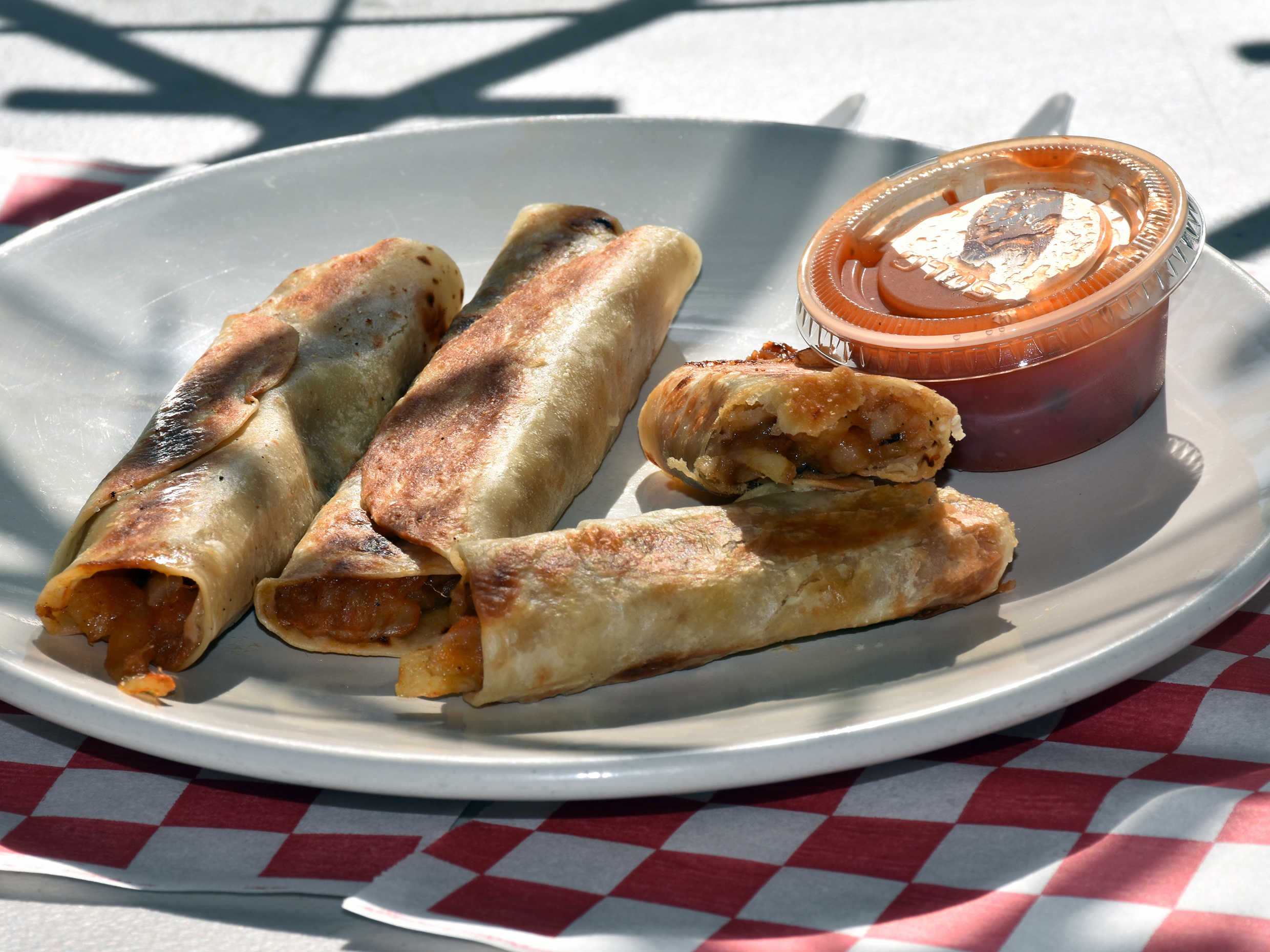 Orden de tres burritos de machaca con verdura y salsa roja.