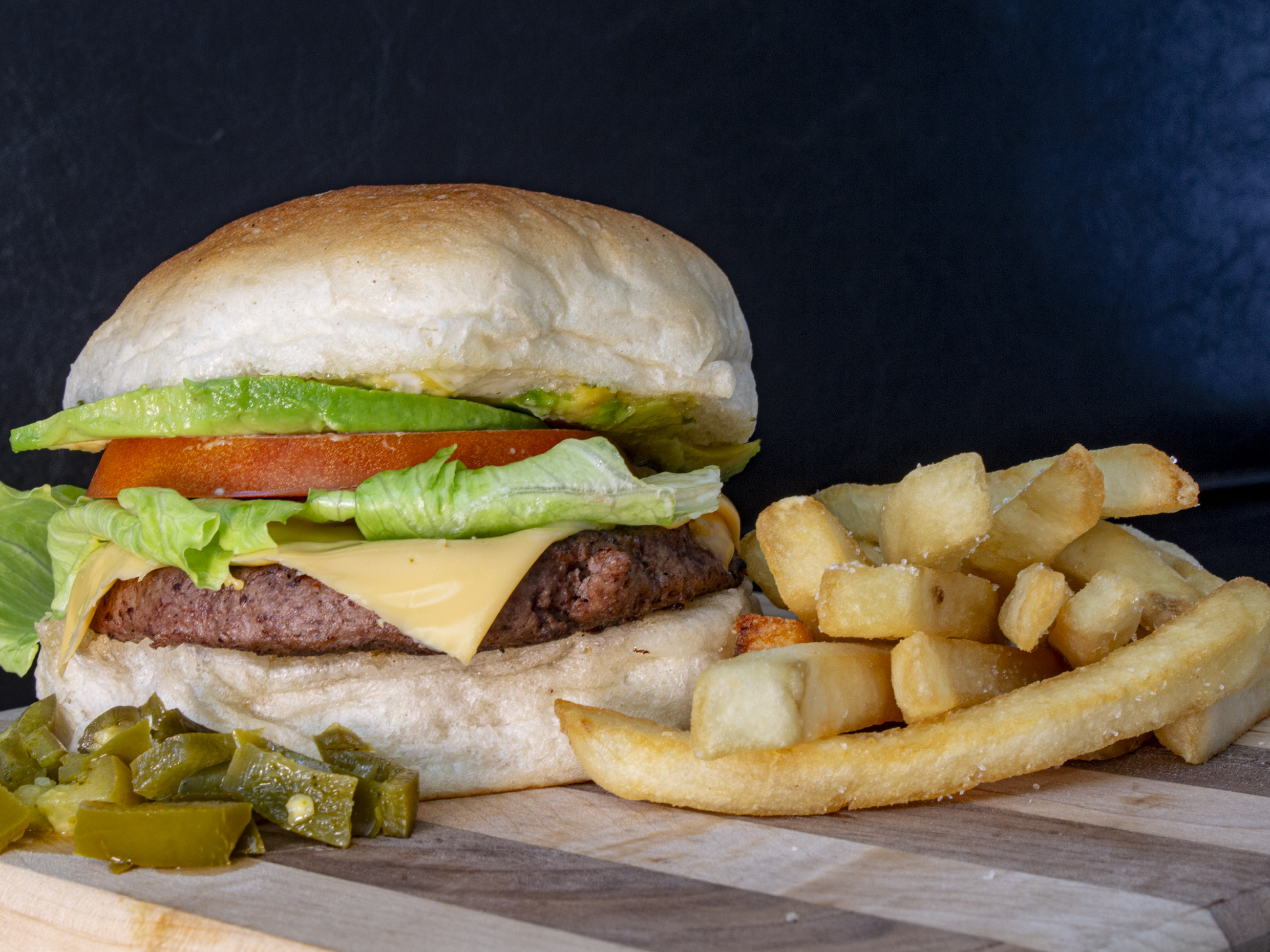 Hamburguesa con dos carnes, queso amarillo, tomate, lechuga, y aguacate.