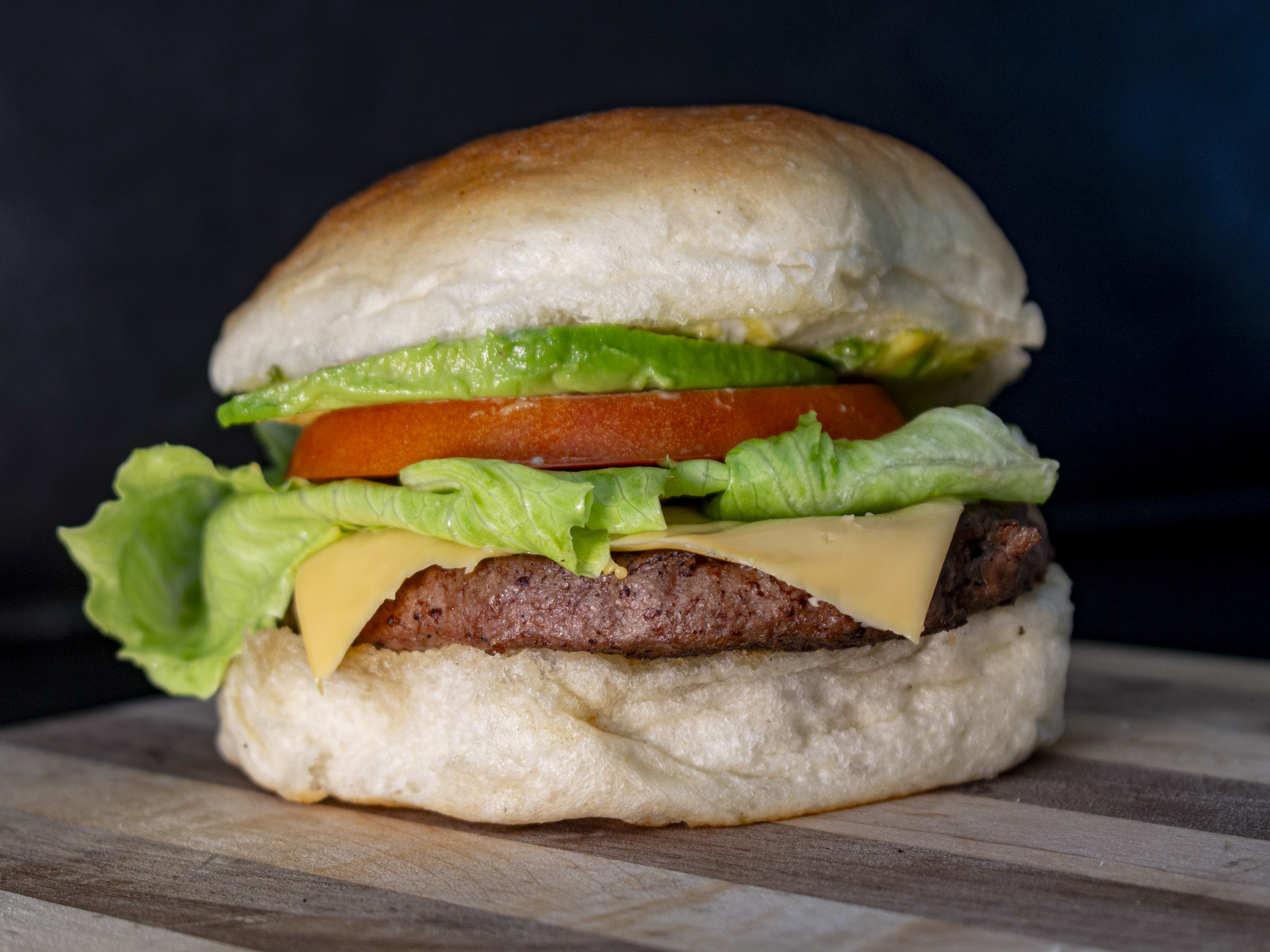 Hamburguesa con una carne, queso amarillo, tomate, aguacate y lechuga.