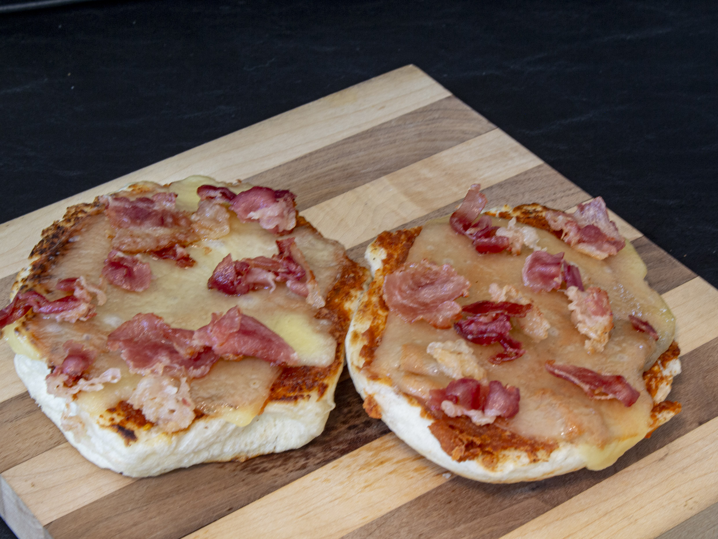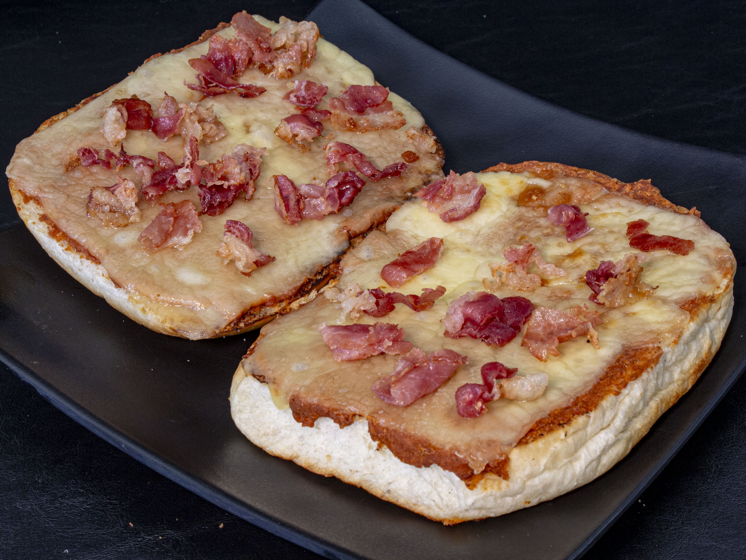 Dos piezas de pan dorado con mantequilla, frijol, queso menonita gratinado y tocino dorado.