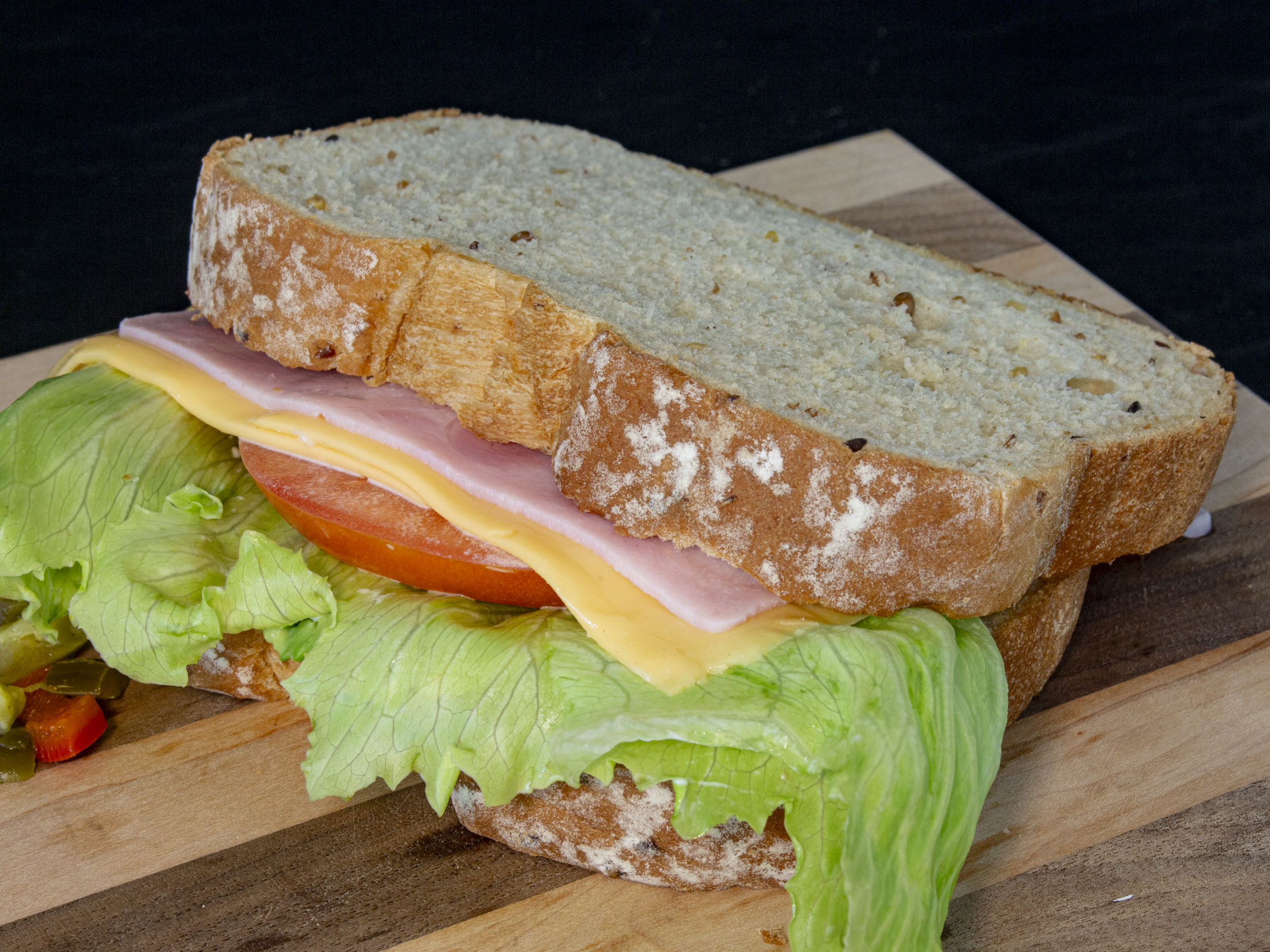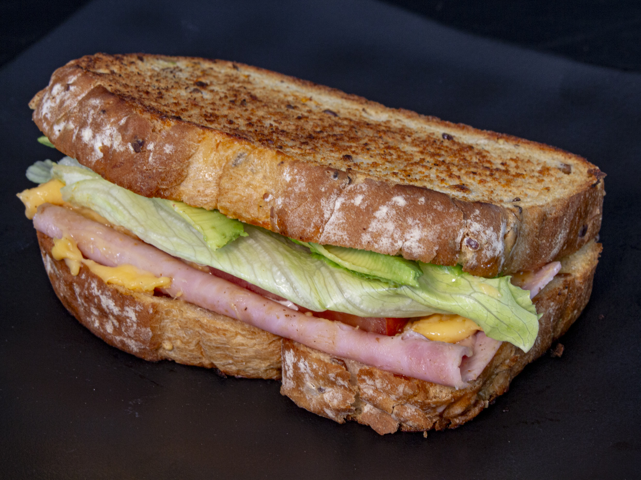 Pan integral de caja dorado con jamón, queso amarillo, aguacate, tomate y lechuga.