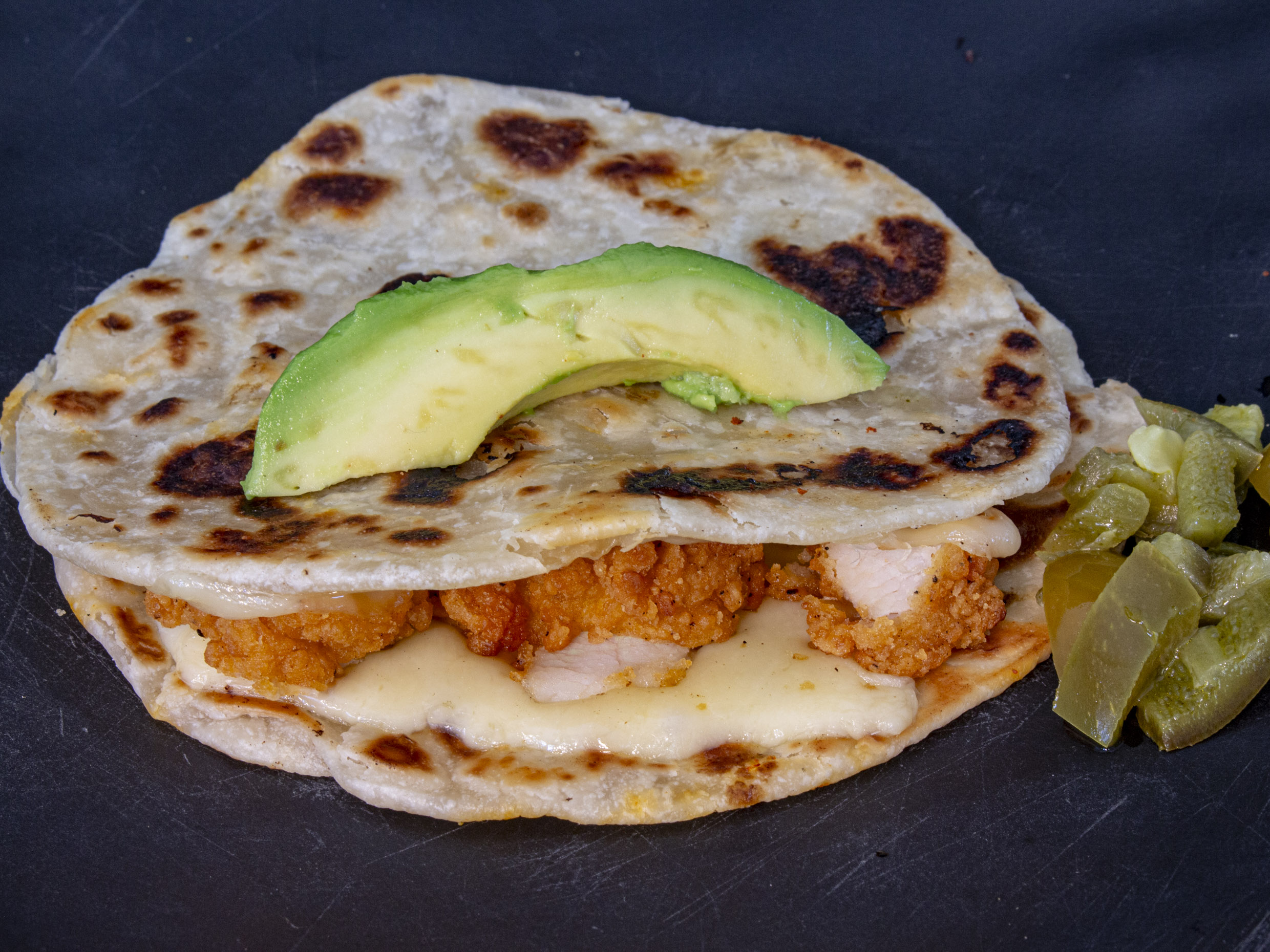Dos tortillas de harina con queso menonita, pechuga a la plancha, frijoles, aguacate y salsa roja.