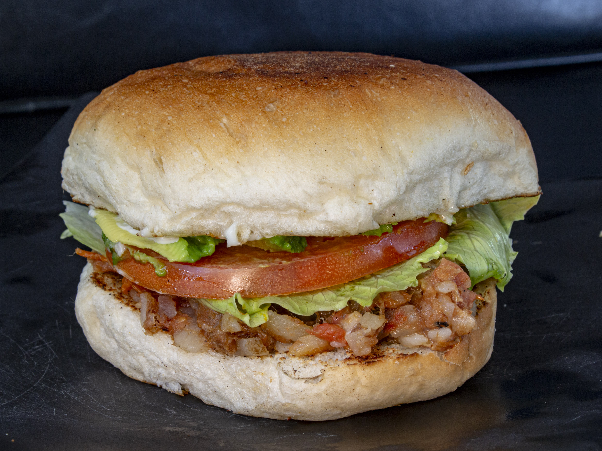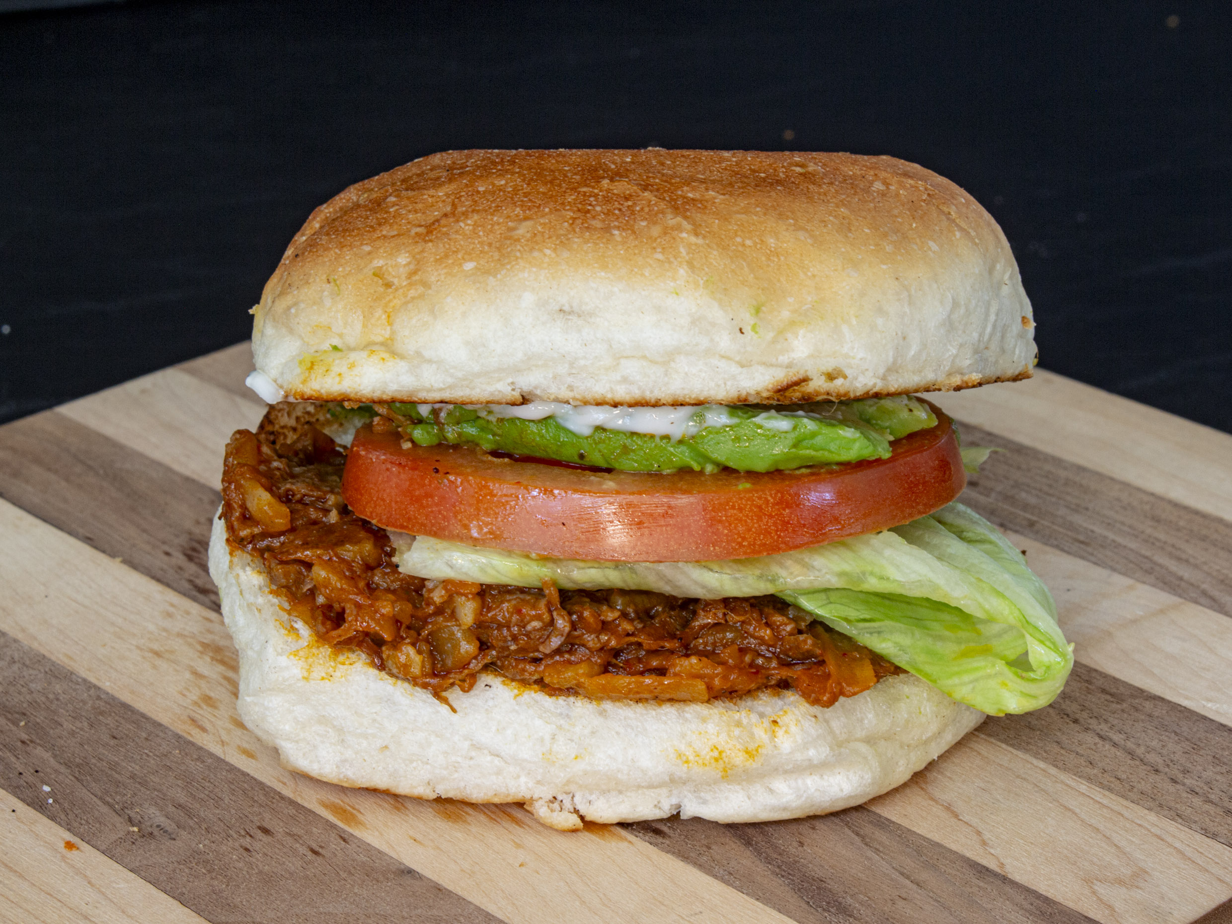 Torta de machaca con verdura en pan virginia, mayonesa, aguacate, tomate y lechuga.