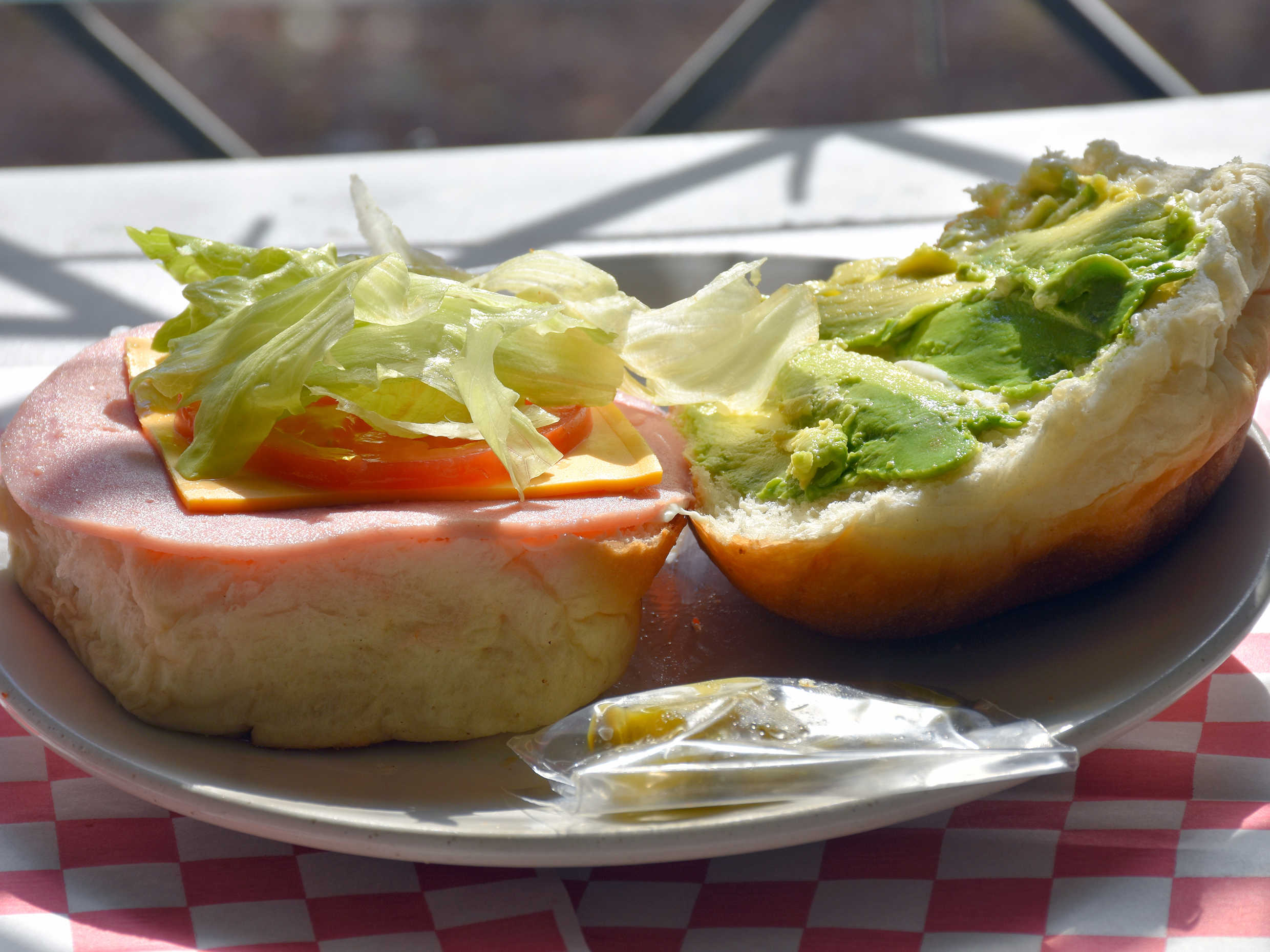 Torta de jamón de pierna y queso amarillo en pan telera, mayonesa, aguacate, tomate y lechuga.
