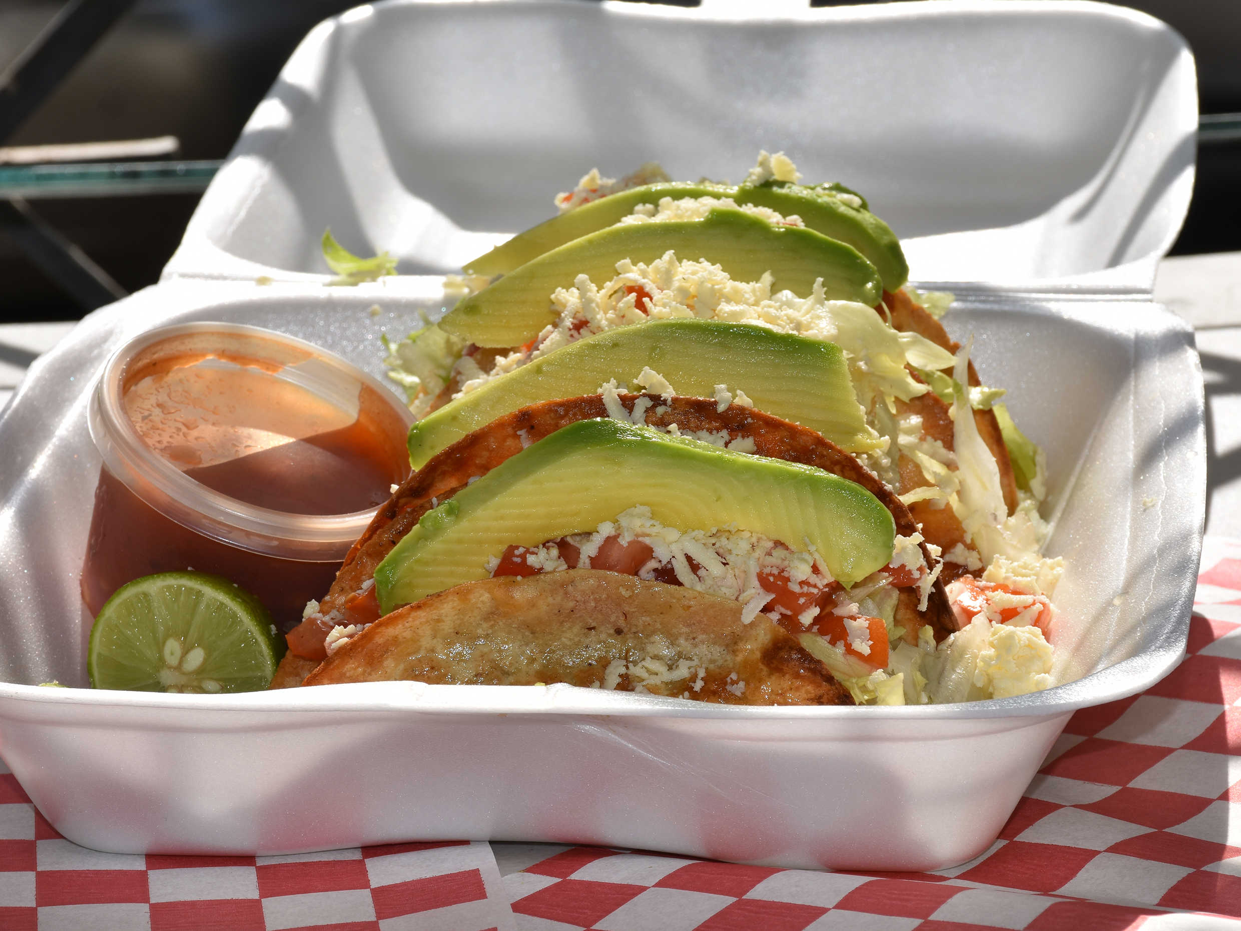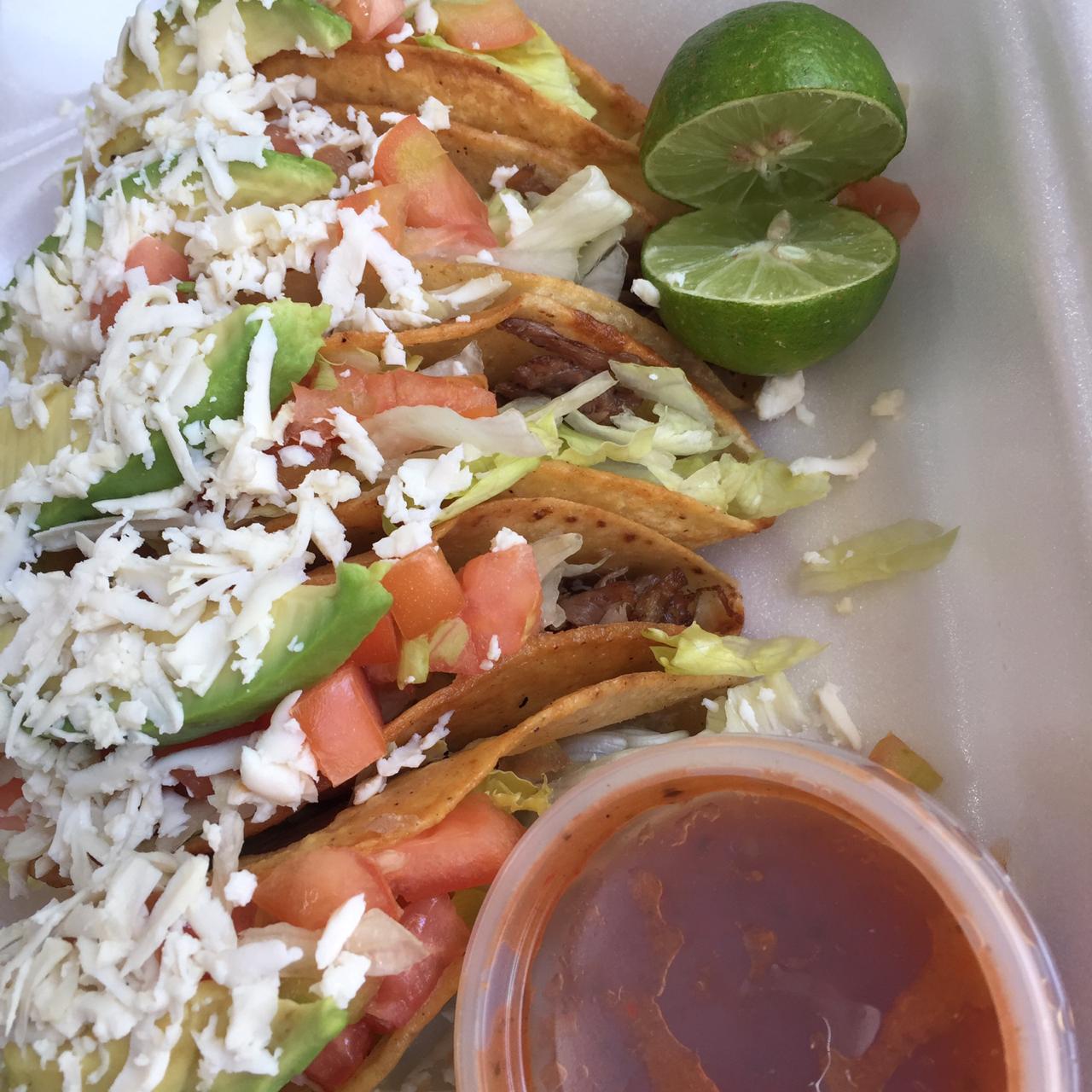 Orden de cinco tacos dorados de res con tomate, lechuga, aguacate y queso.