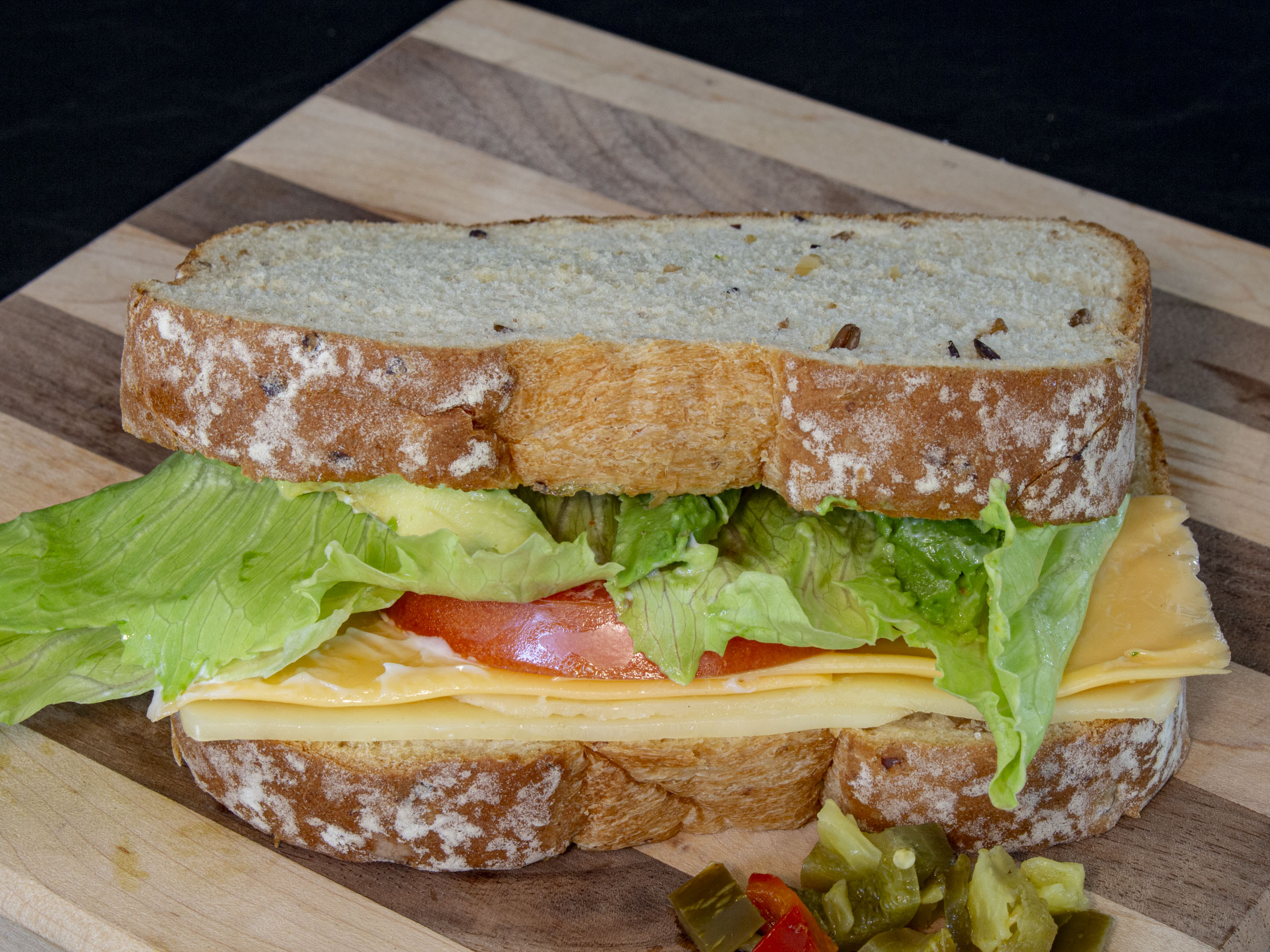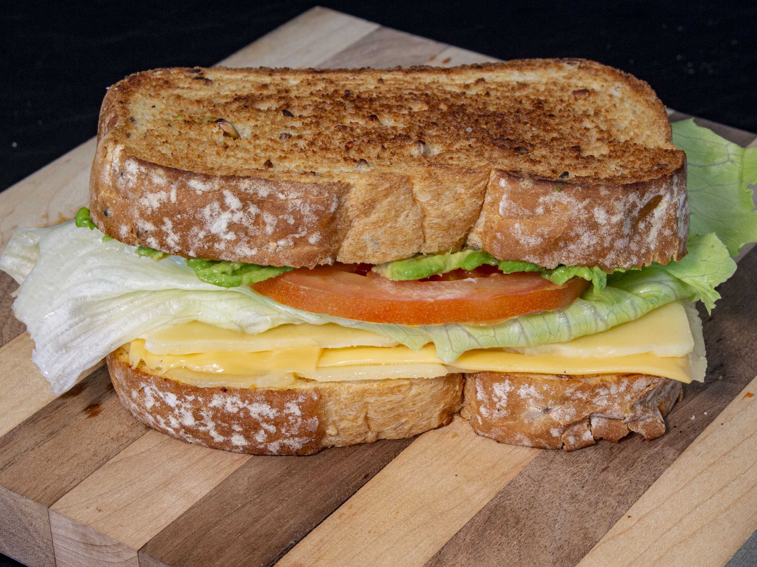 Pan integral de caja con queso amarillo y menonita, aguacate, tomate y lechuga.