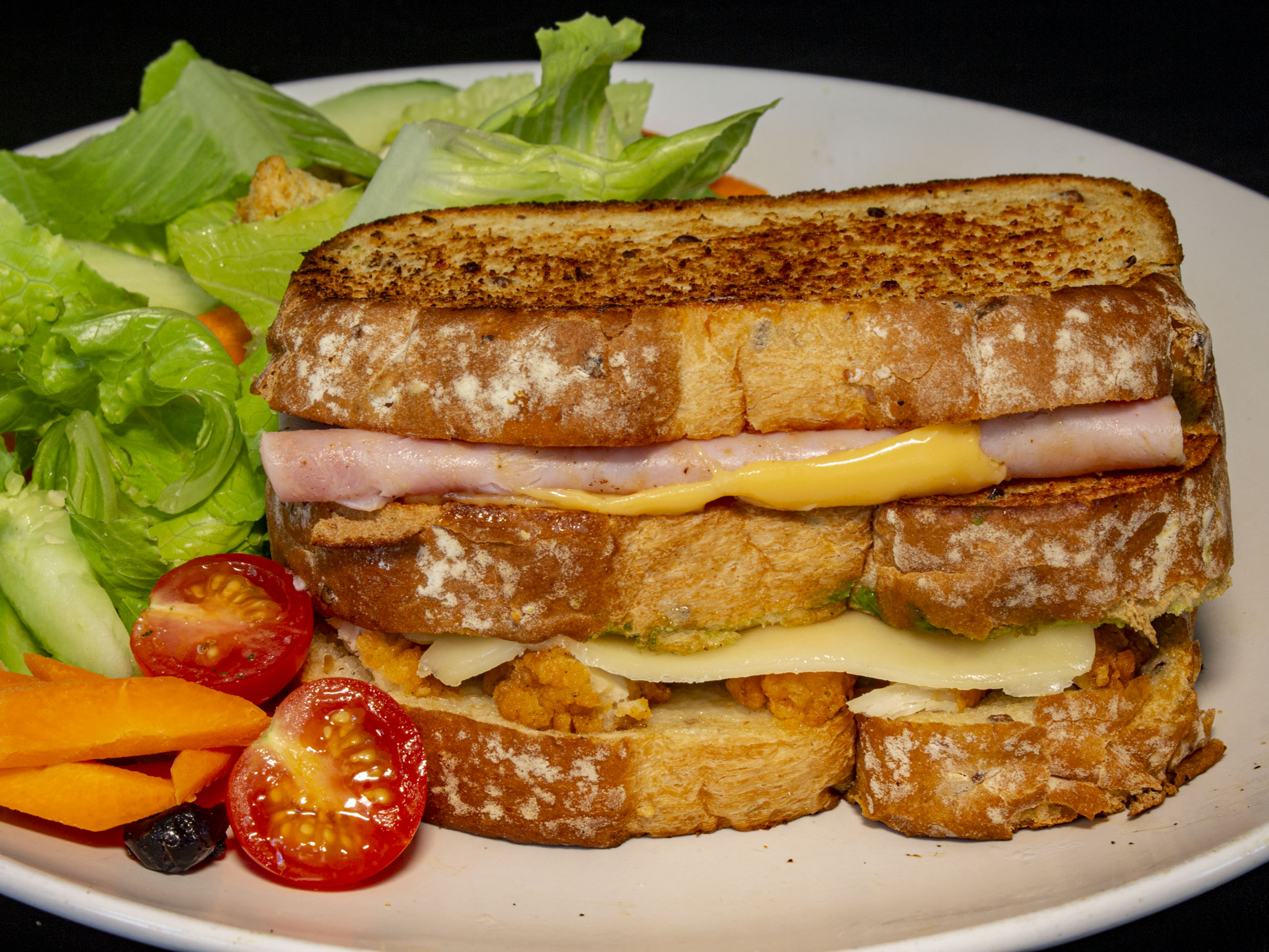 Pan integral con pechuga de pollo, jamón de pavo y queso acompañado de ensalada verde fresca.