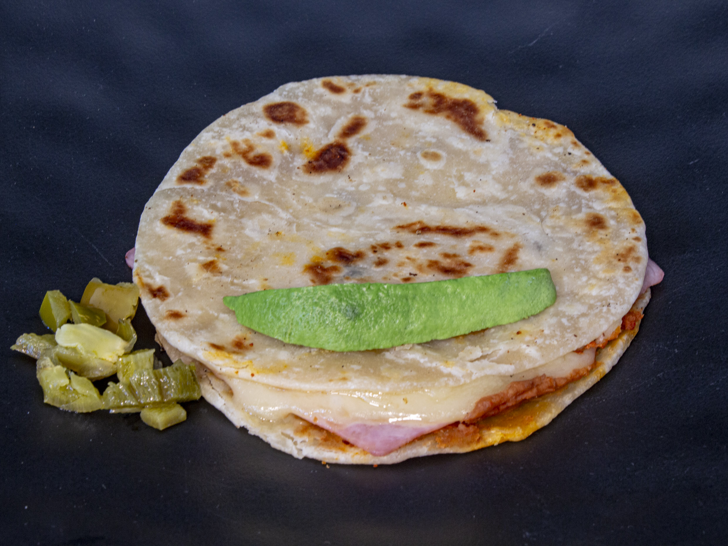 Dos tortillas de harina con queso menonita, jamón de pavo, frijoles, aguacate y salsa roja.