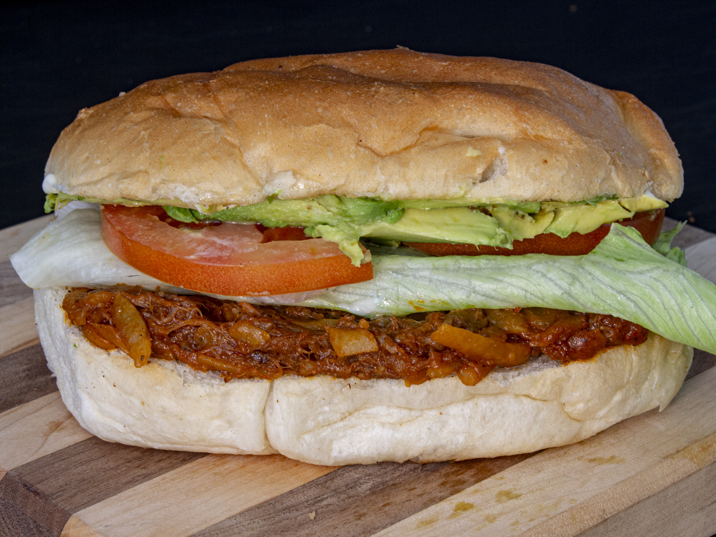 Torta de guisado de carne de res con chile colorado y papas, en pan virginia dorado, mayonesa, aguacate, tomate y lechuga, chile jalapeño opcional.