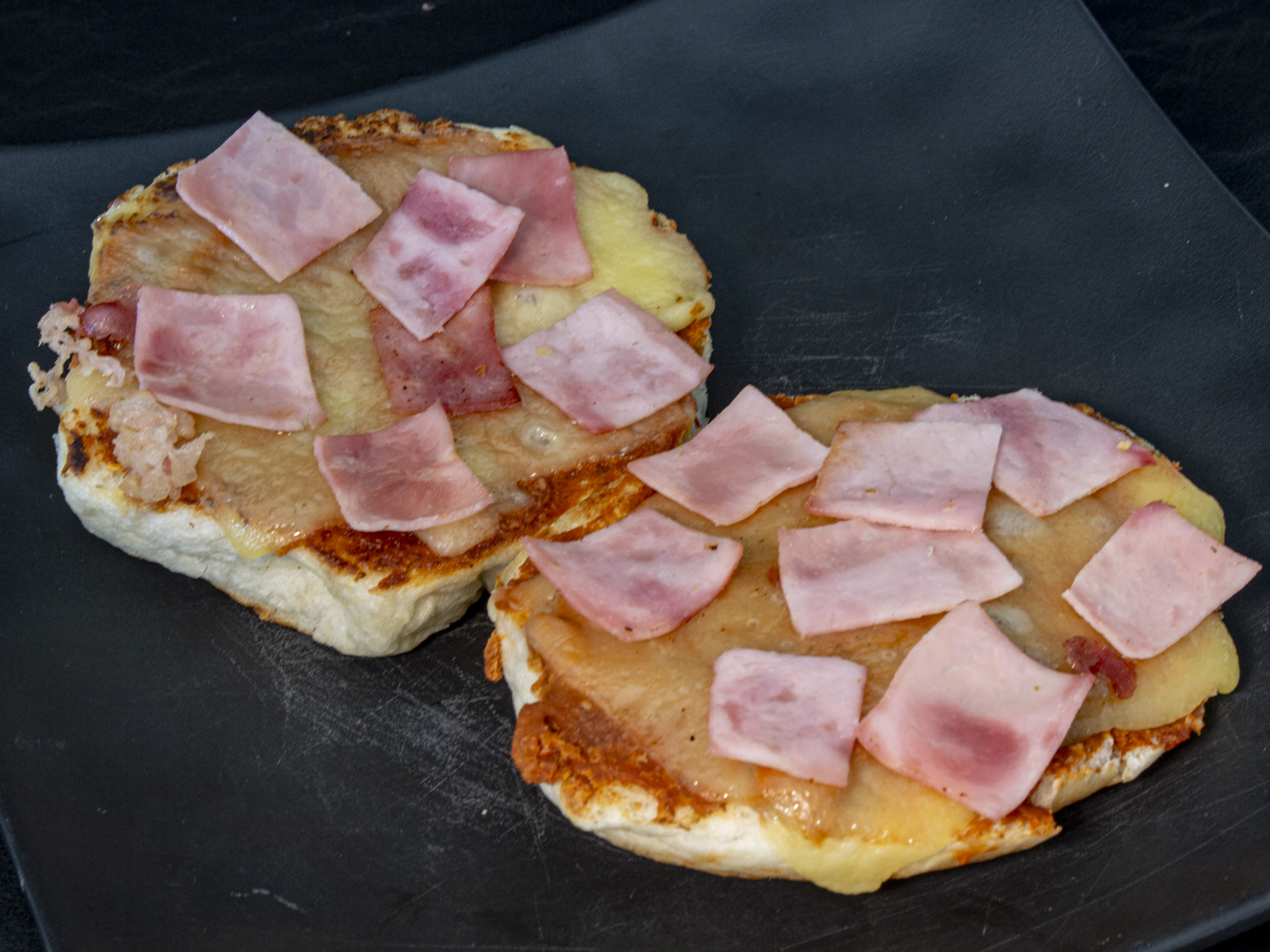 Dos piezas de pan dorado con mantequilla, frijol, queso menonita gratinado y jamón de pavo
