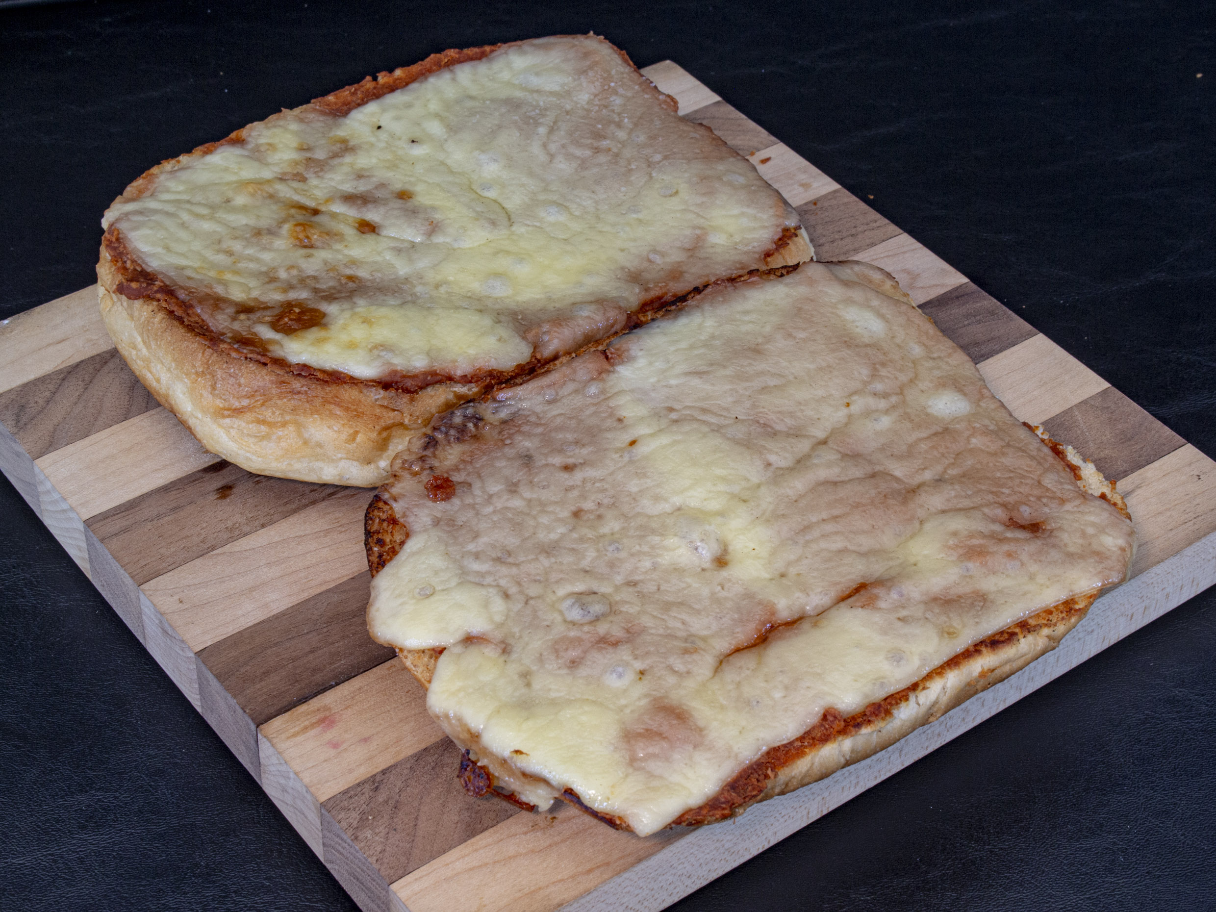 Dos piezas de pan dorado con mantequilla, frijol y queso menonita gratinado con salsa roja.