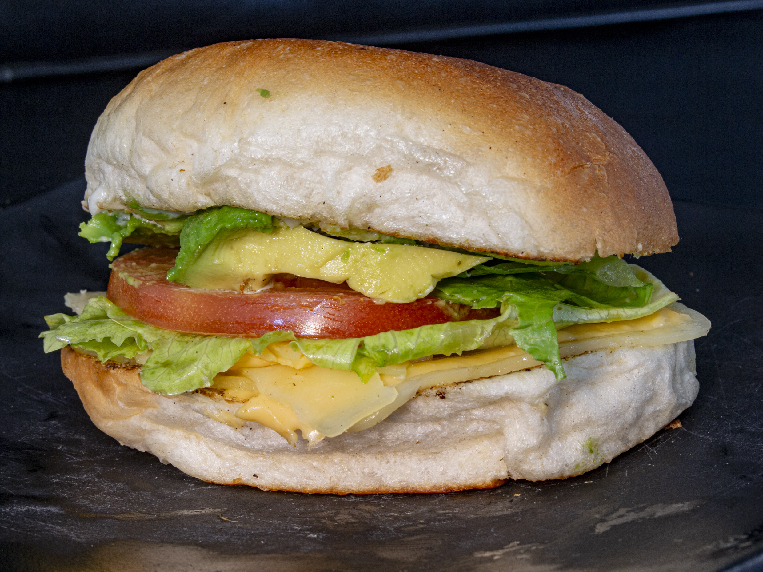 Torta de queso amarillo y queso menonita en pan virginia, mayonesa, aguacate, tomate y lechuga.