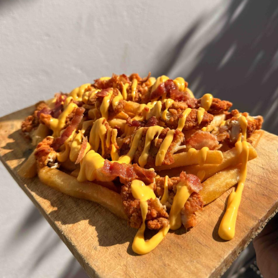 Papas + pollo + tocino + queso cheddar