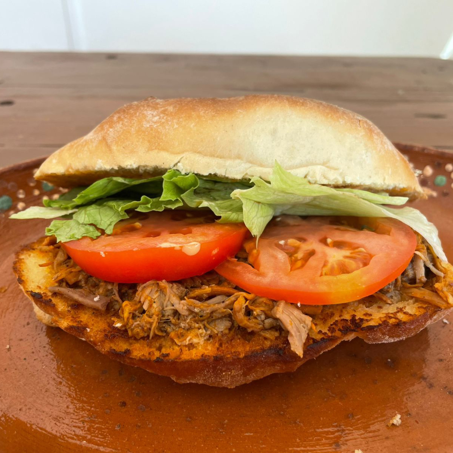 Torta con barbacoa, lechuga, tomate, cebolla y chile jalapeño.