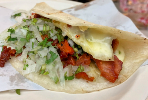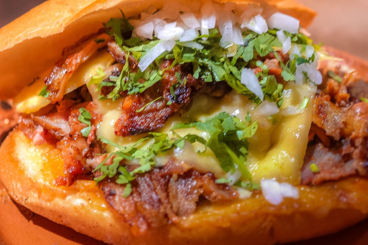 Pan telera, carne al pastor, queso, cebolla, cilantro y piña.