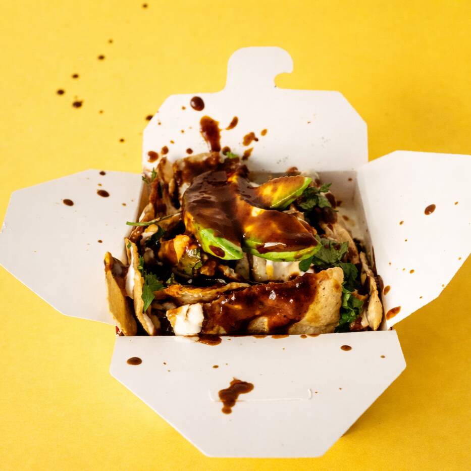 Chilaquiles en Salsa de Mole, totopo de maíz (60 a 70 gramos aprox) incluye pollo (50 g aprox) y toppings a elegir por el cliente.