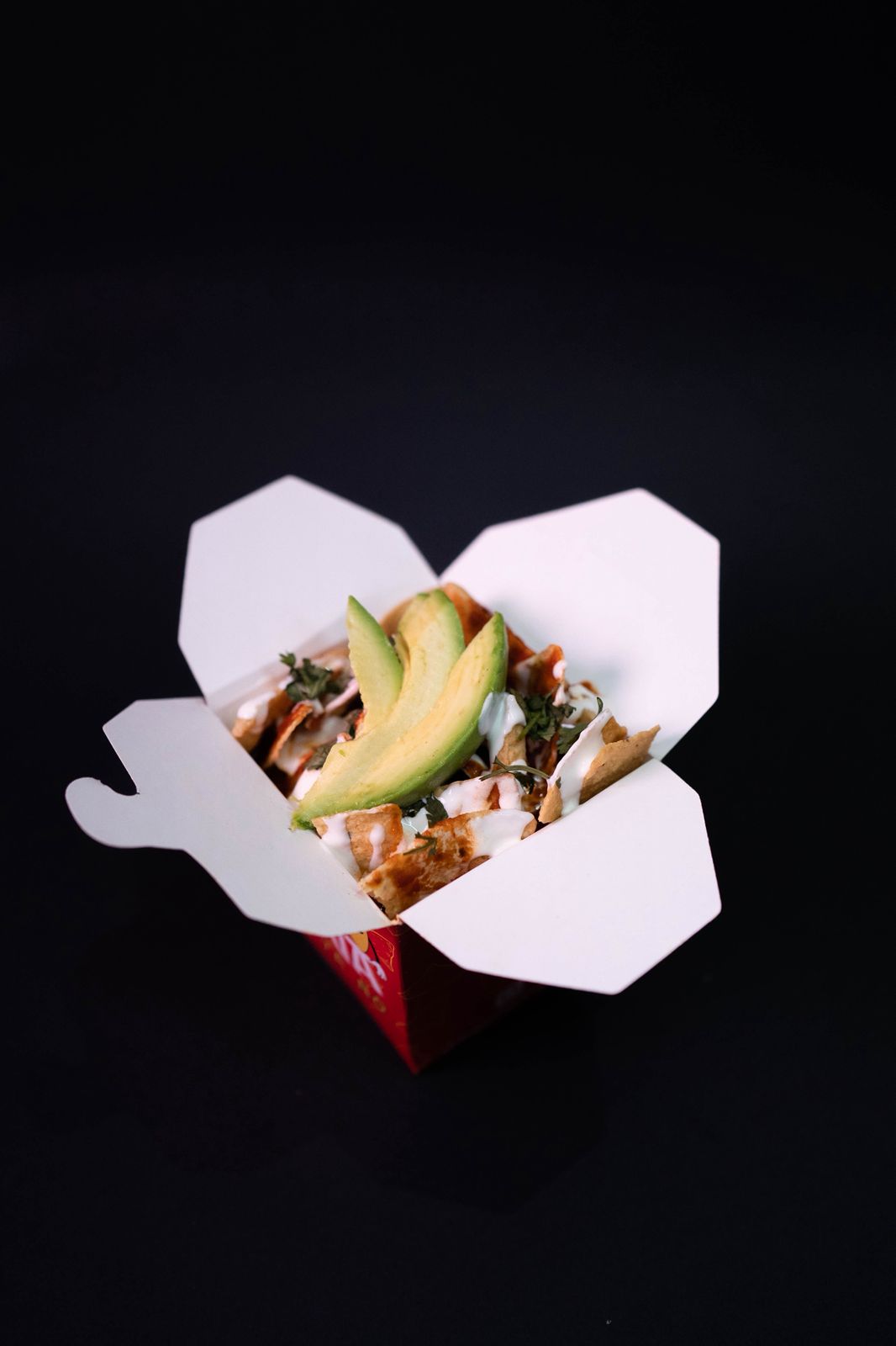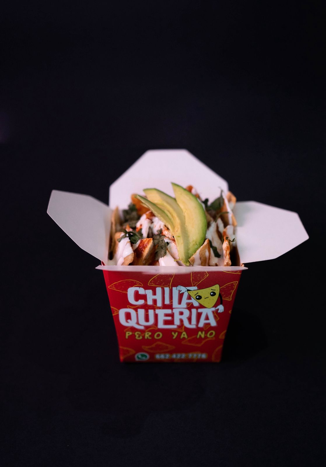Chilaquiles en salsa roja (a base de chile colorado), totopo de maíz (60 a 70 gramos aprox) incluye pollo (50 g aprox) y toppings a elegir por el cliente.