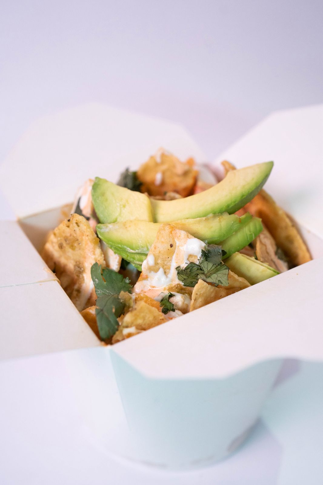 Chilaquiles Mixtos (salsa verde y roja), totopo de maíz (60 a 70 gramos aprox) incluye pollo (50 g aprox) y toppings a elegir por el cliente.