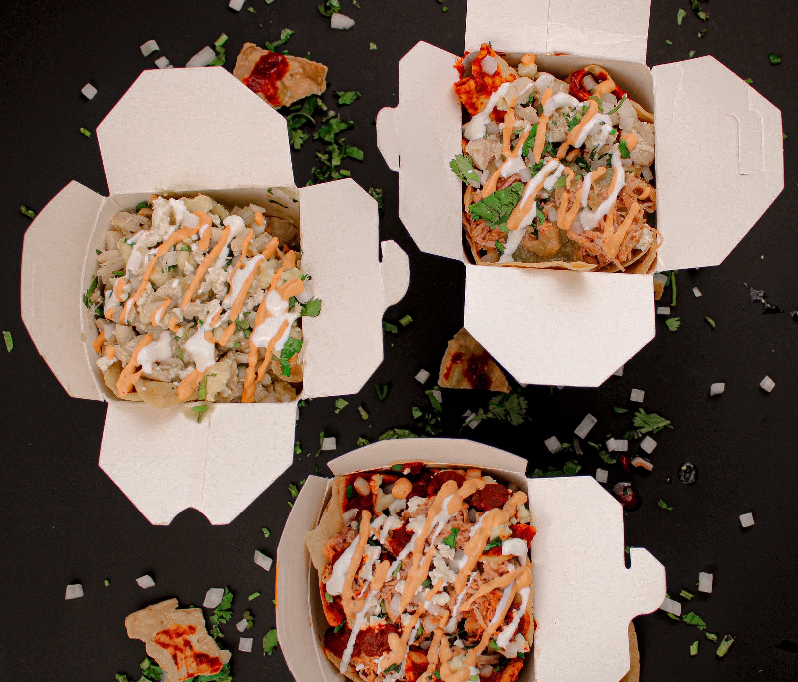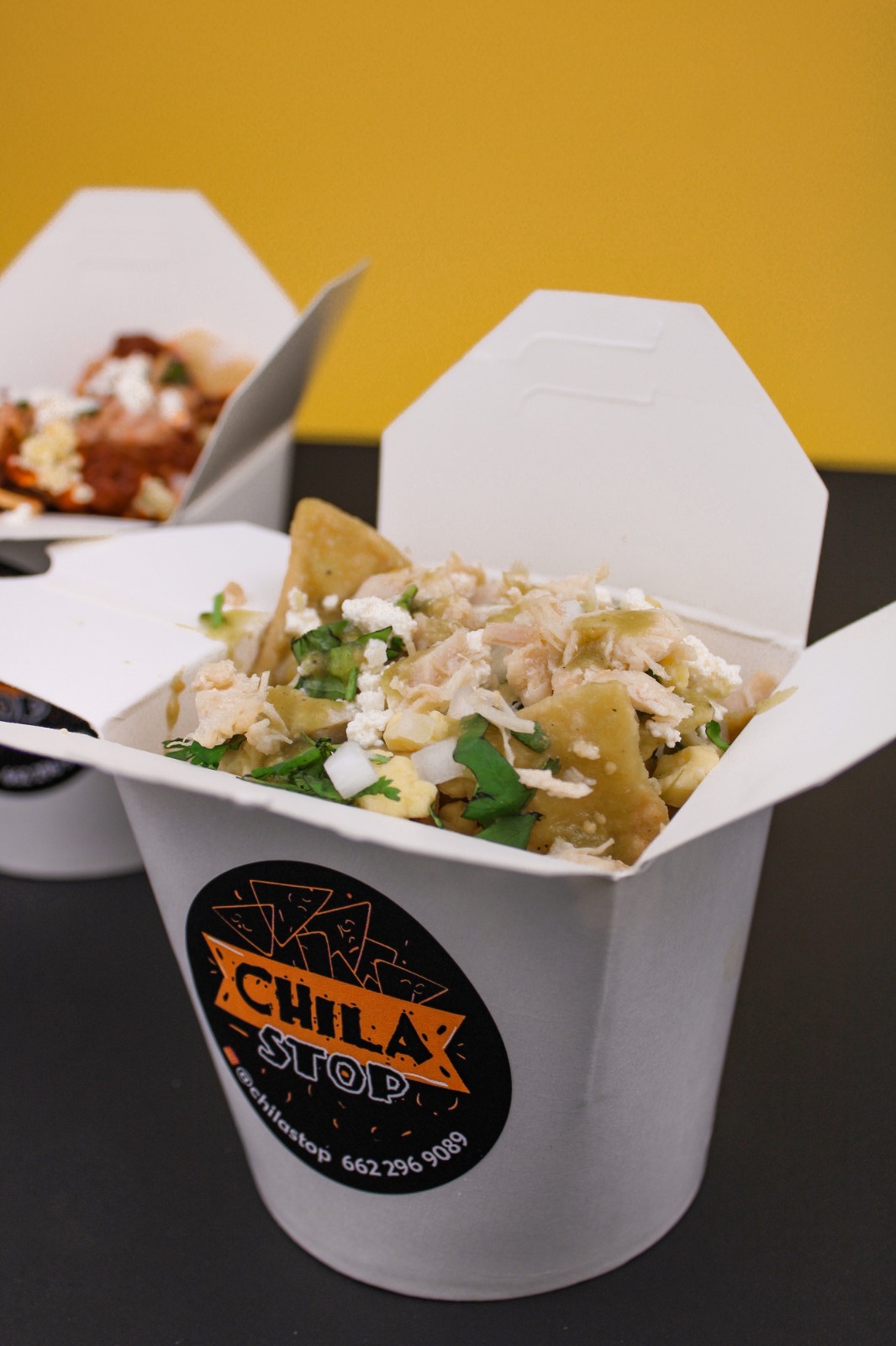 Aprox. 100g de totopos, 90g de Pollo con 8oz de salsa a elegir y queso chihuahua