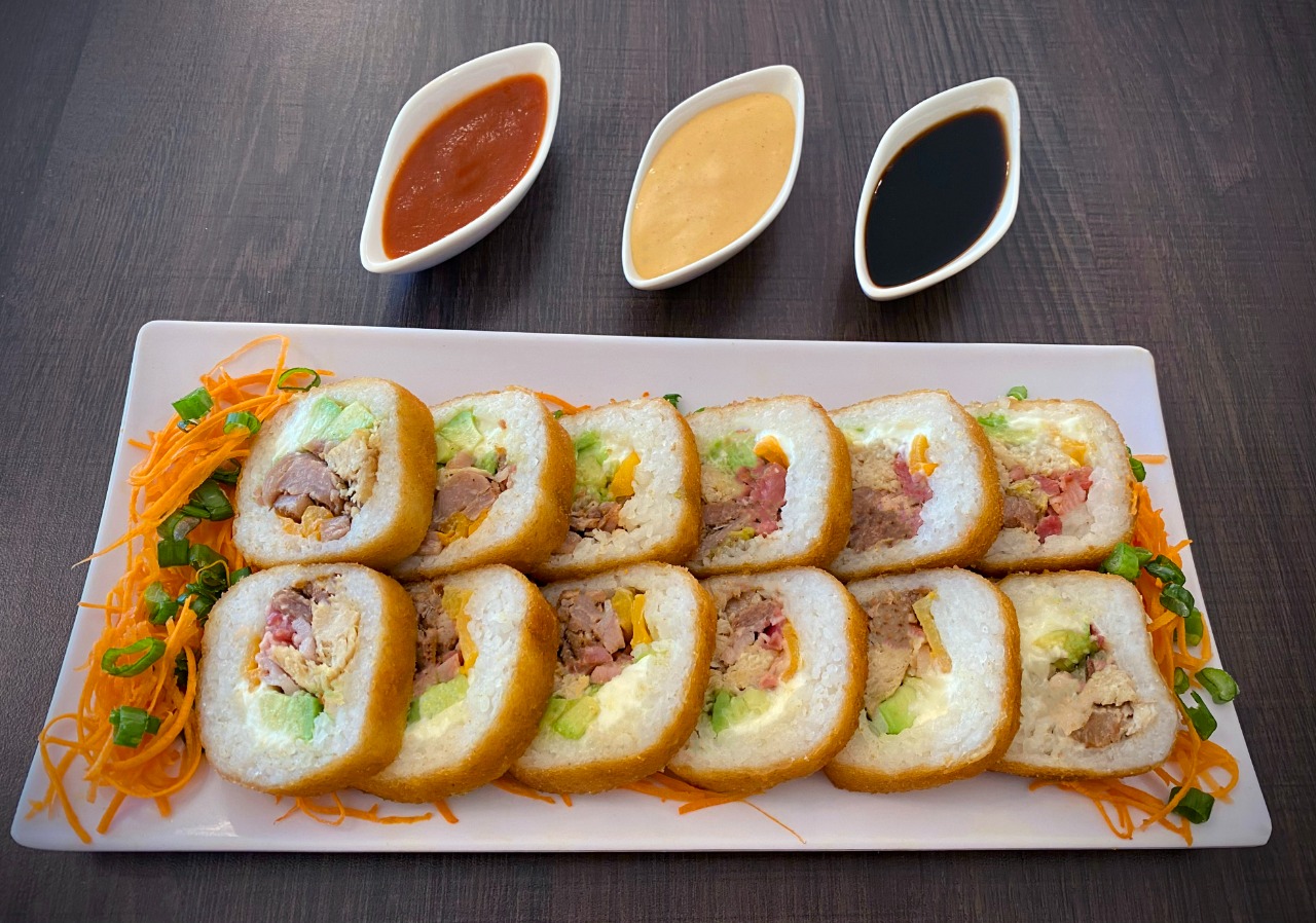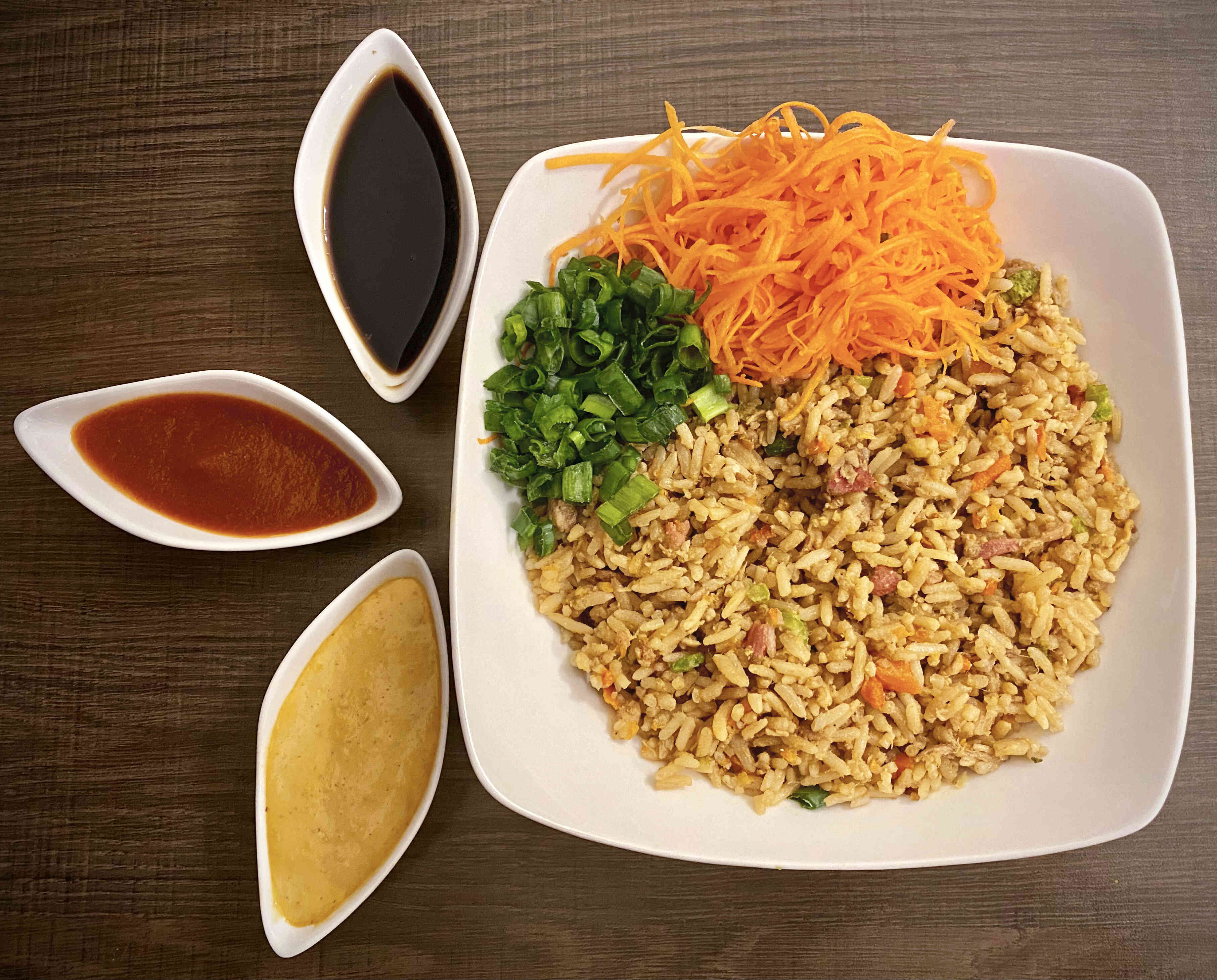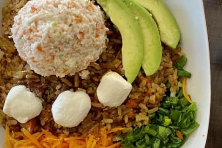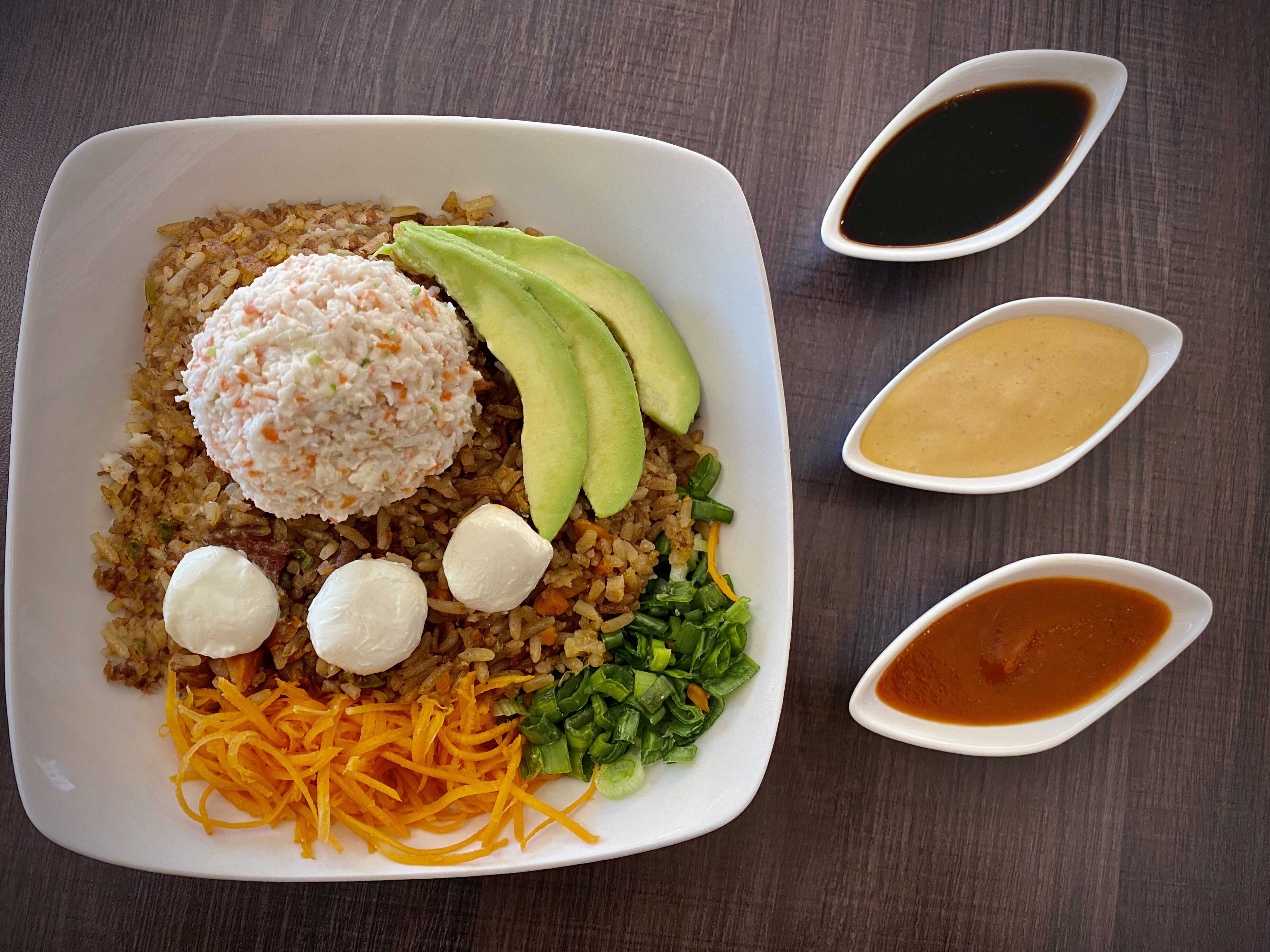 Arroz yakimeshi con topping de aguacate, tampico y queso crema