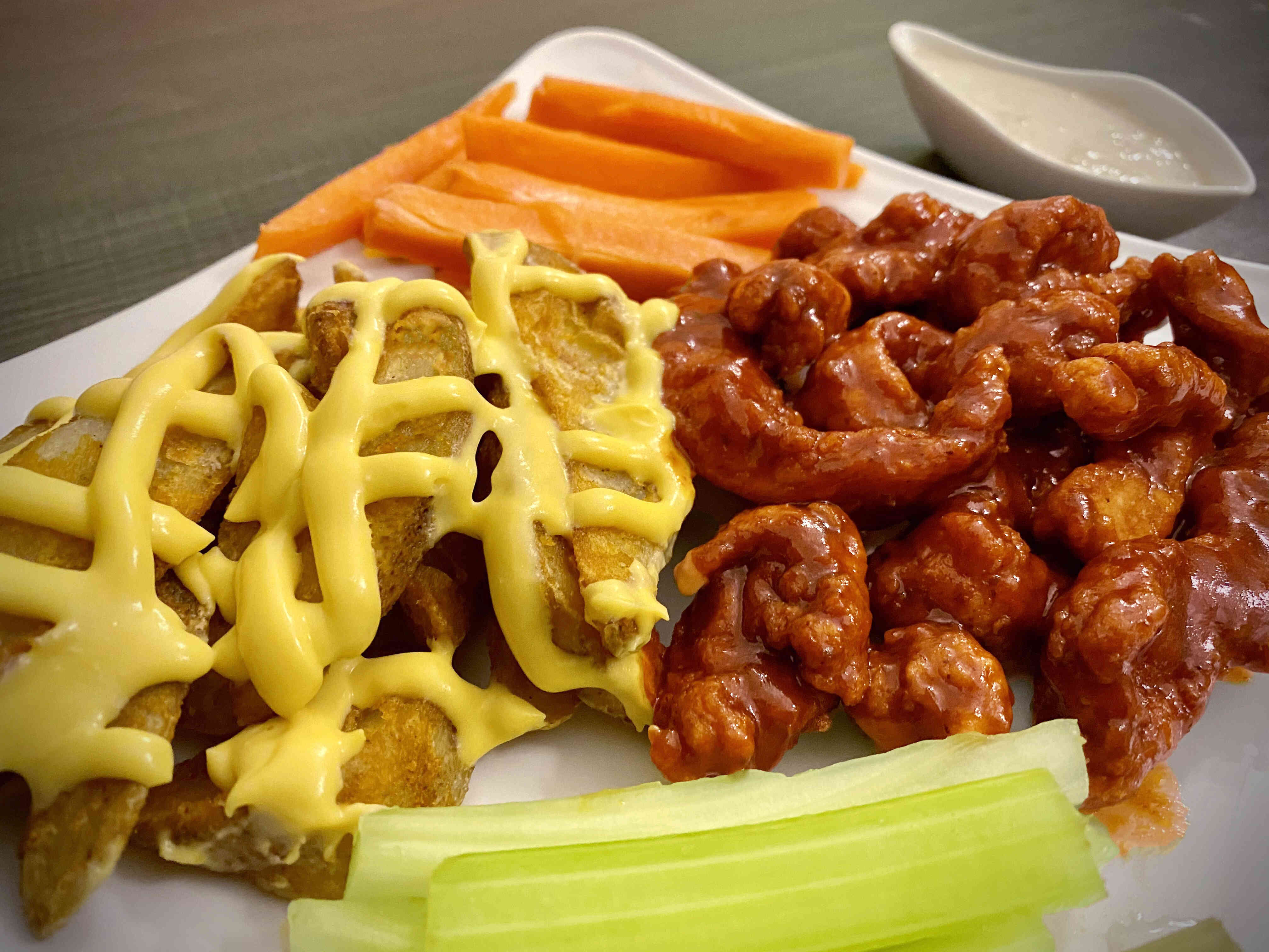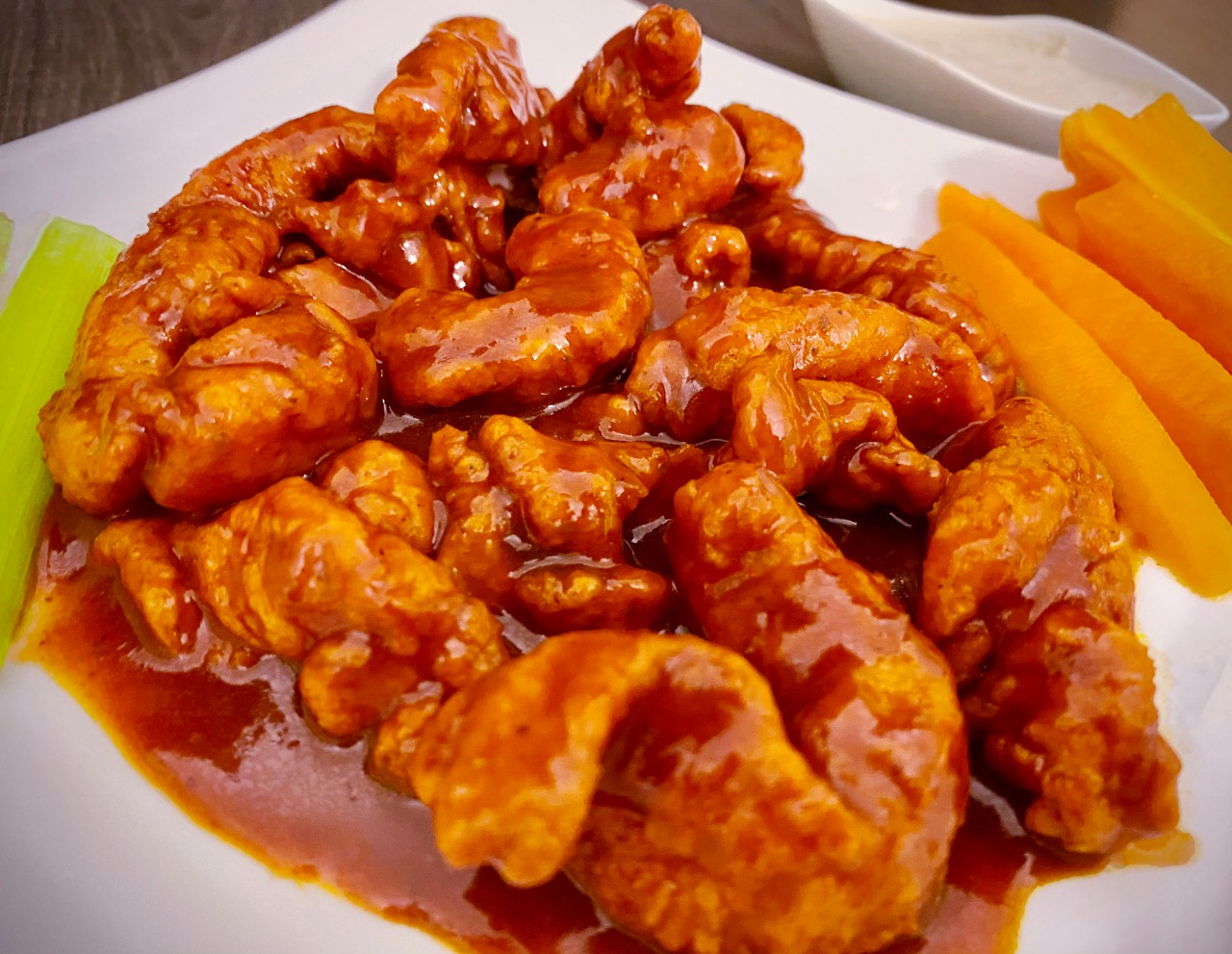 (12 Pzas.)Alitas de Pollo, bañadas en salsa de su preferencia, acompañado de aderezo ranch y papas a la francesa