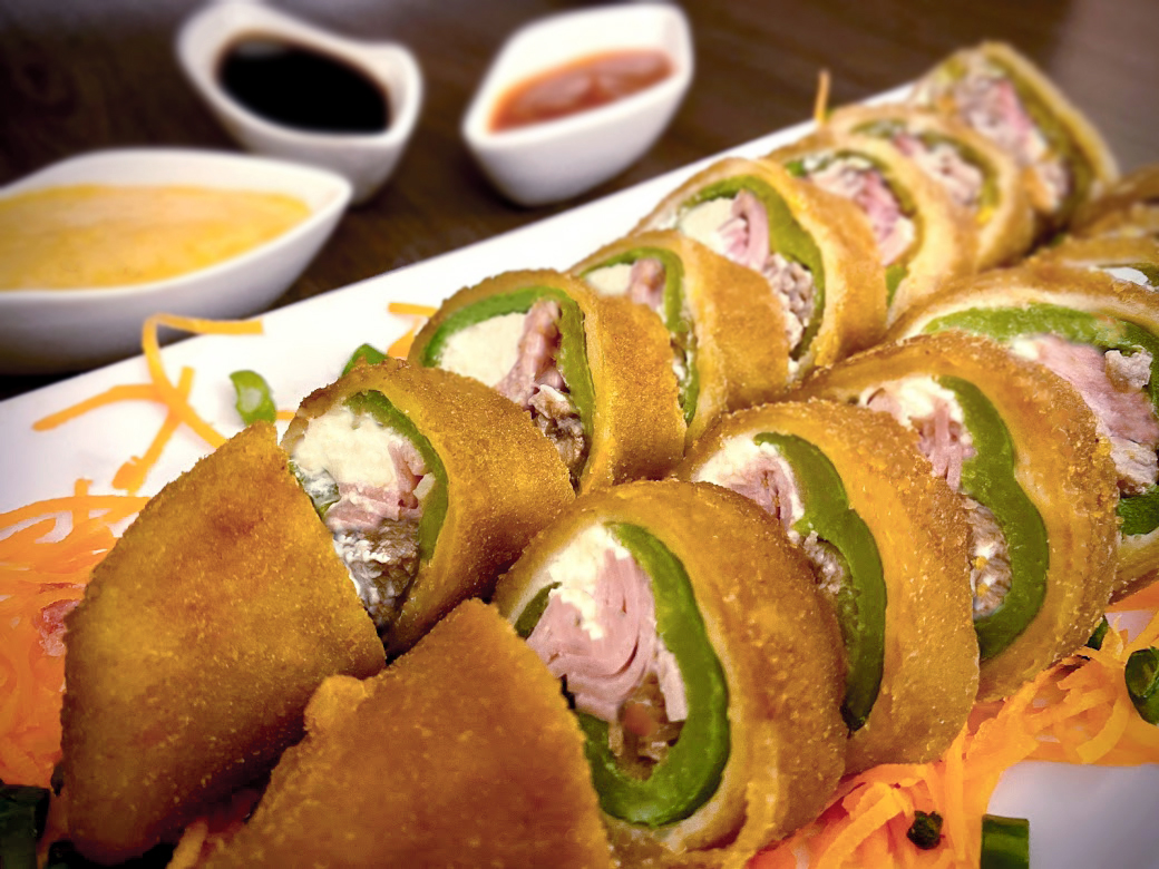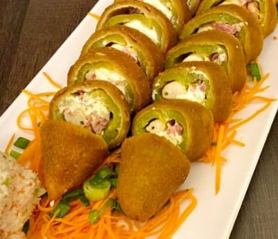 2 Chiles rellenos de camarón, tocino, jamón y queso crema, OPCION : NATURAL O EMPANIZADO