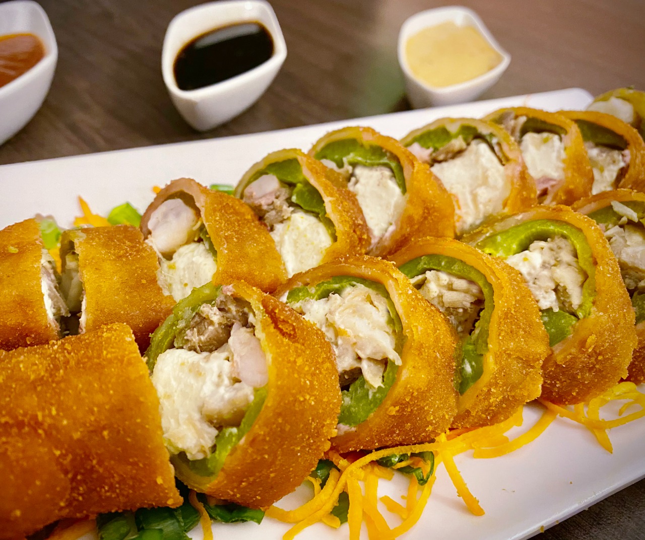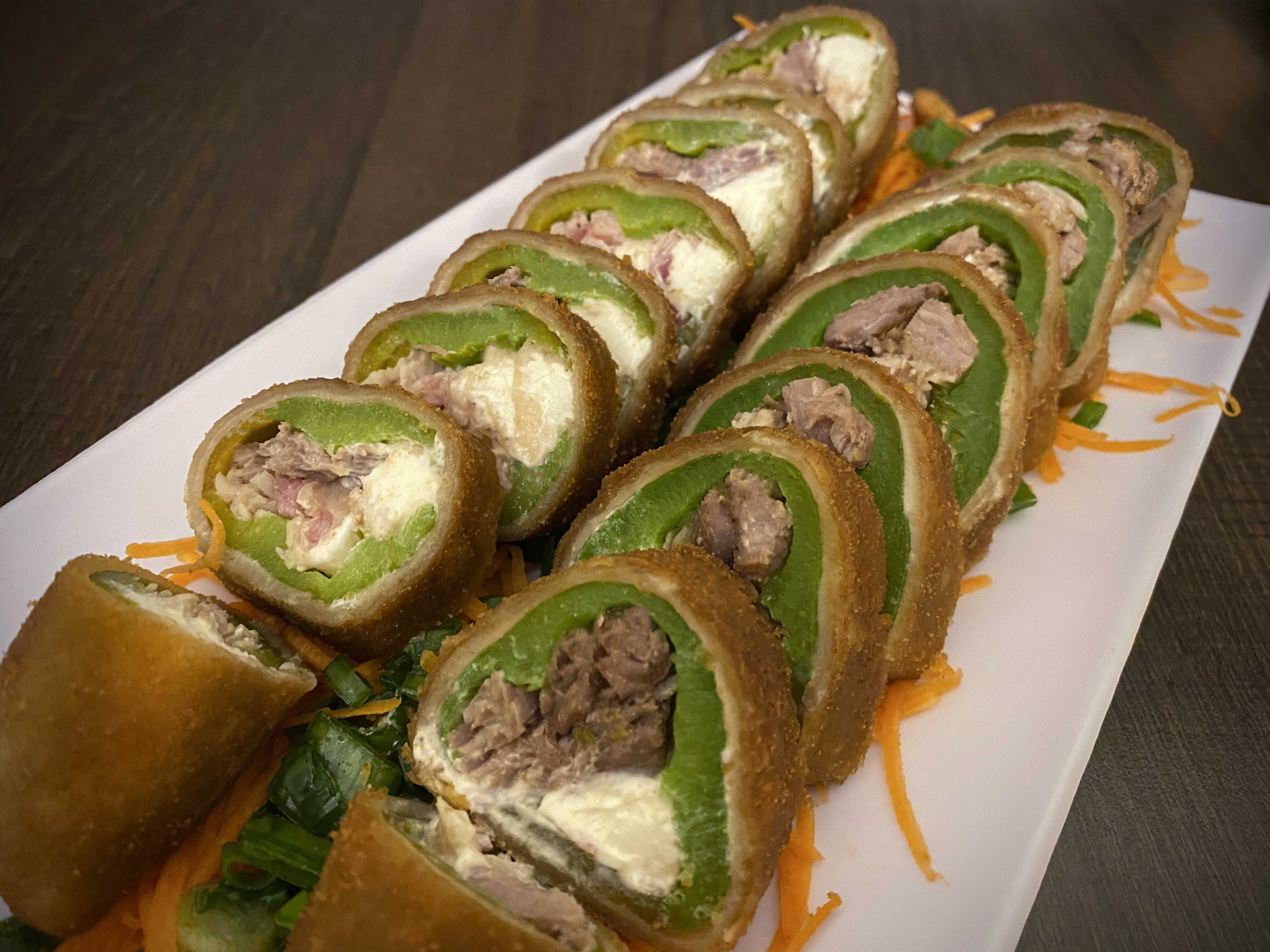 2 Chiles rellenos de Camarón, Pollo, Res y queso crema, OPCION : NATURAL O EMPANIZADO