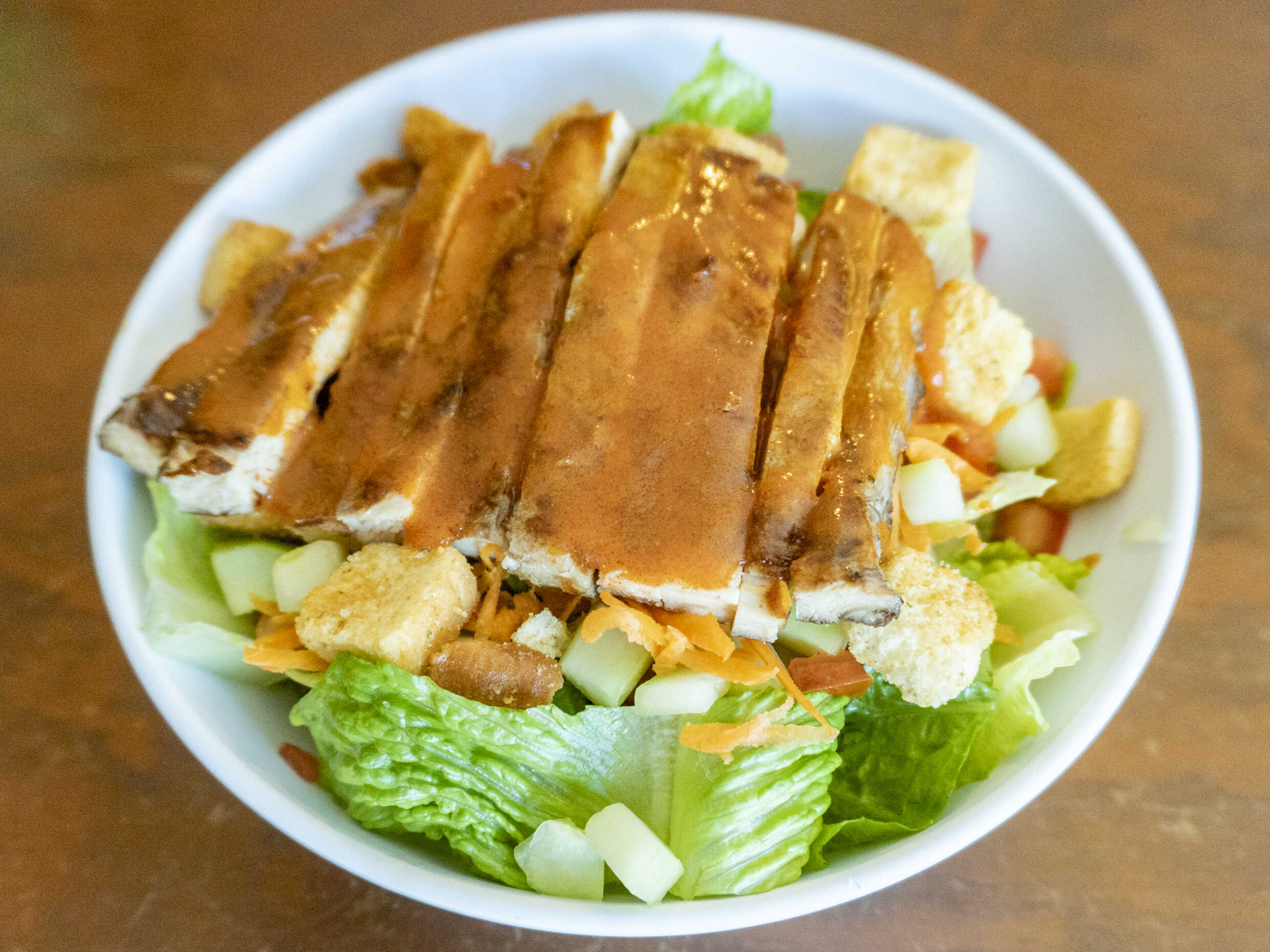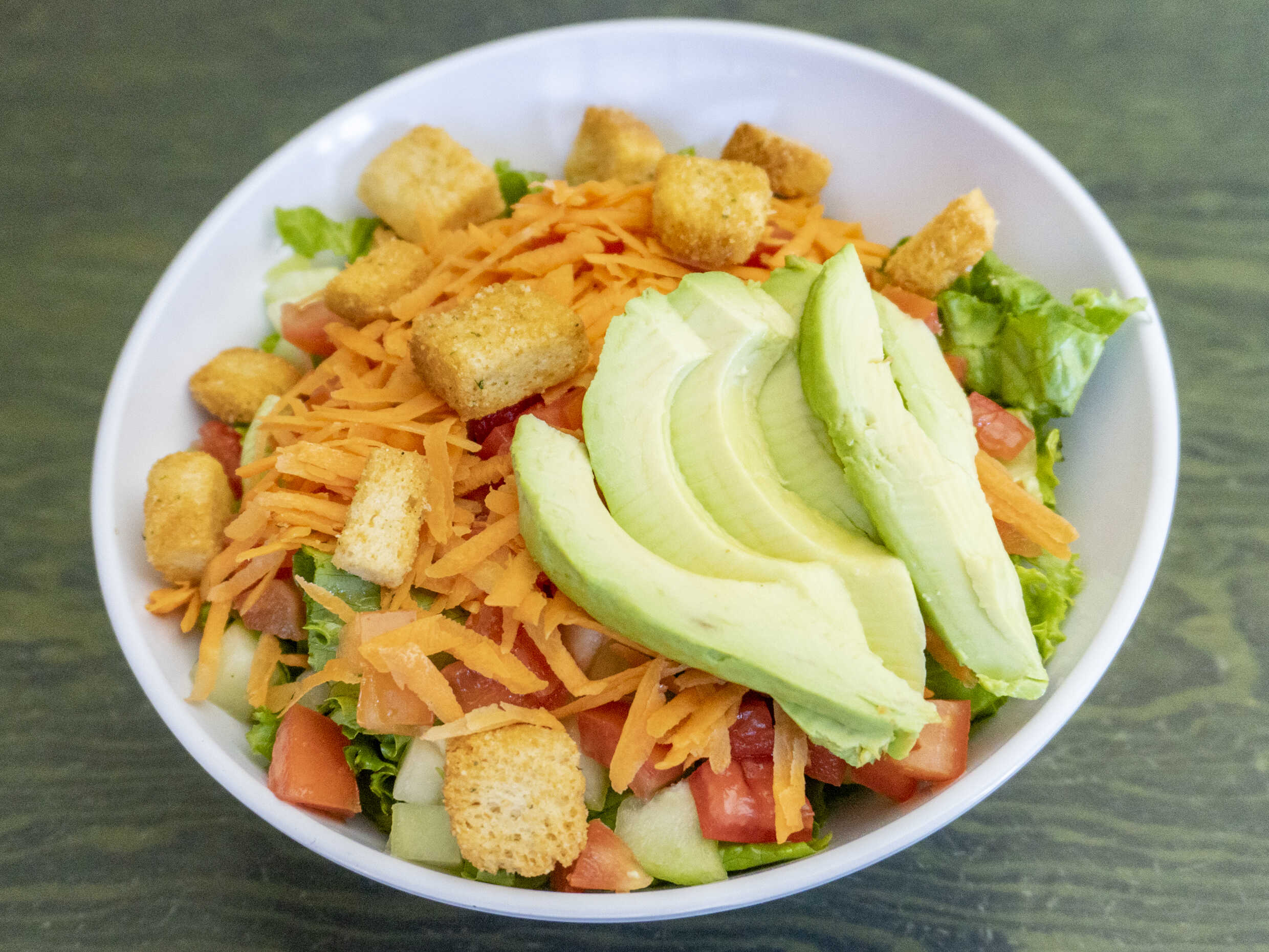 Lechuga fresca, tomate, aguacate, pepino, zanahoria y croutones con 170 gramos de boneless con salsa.