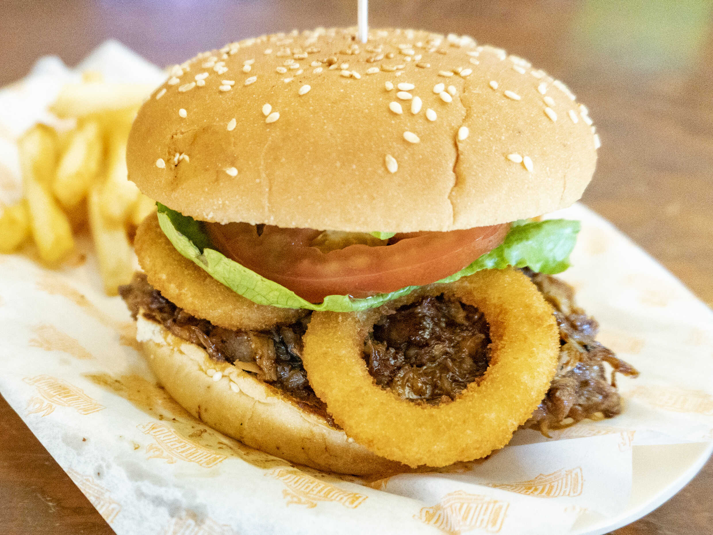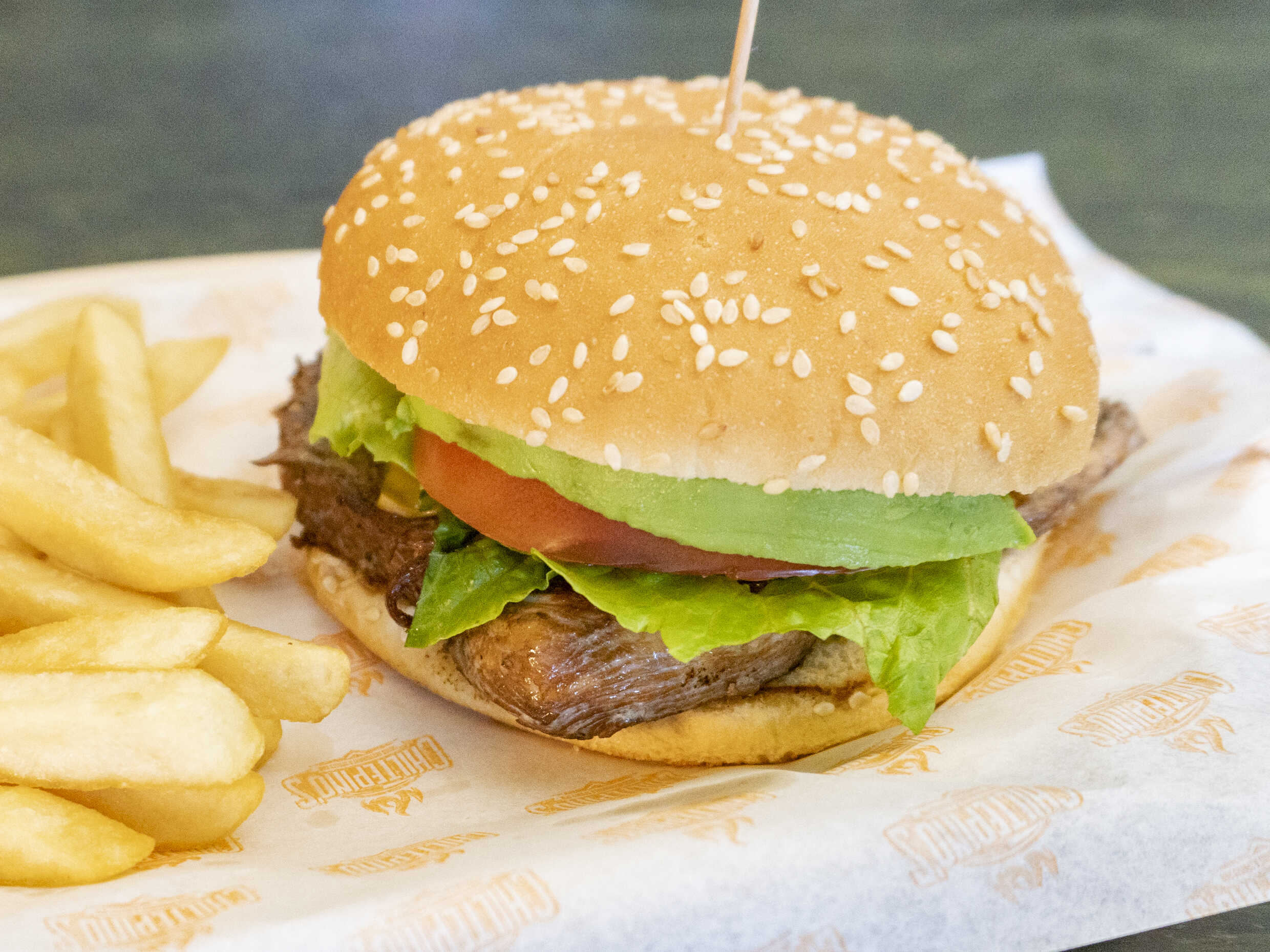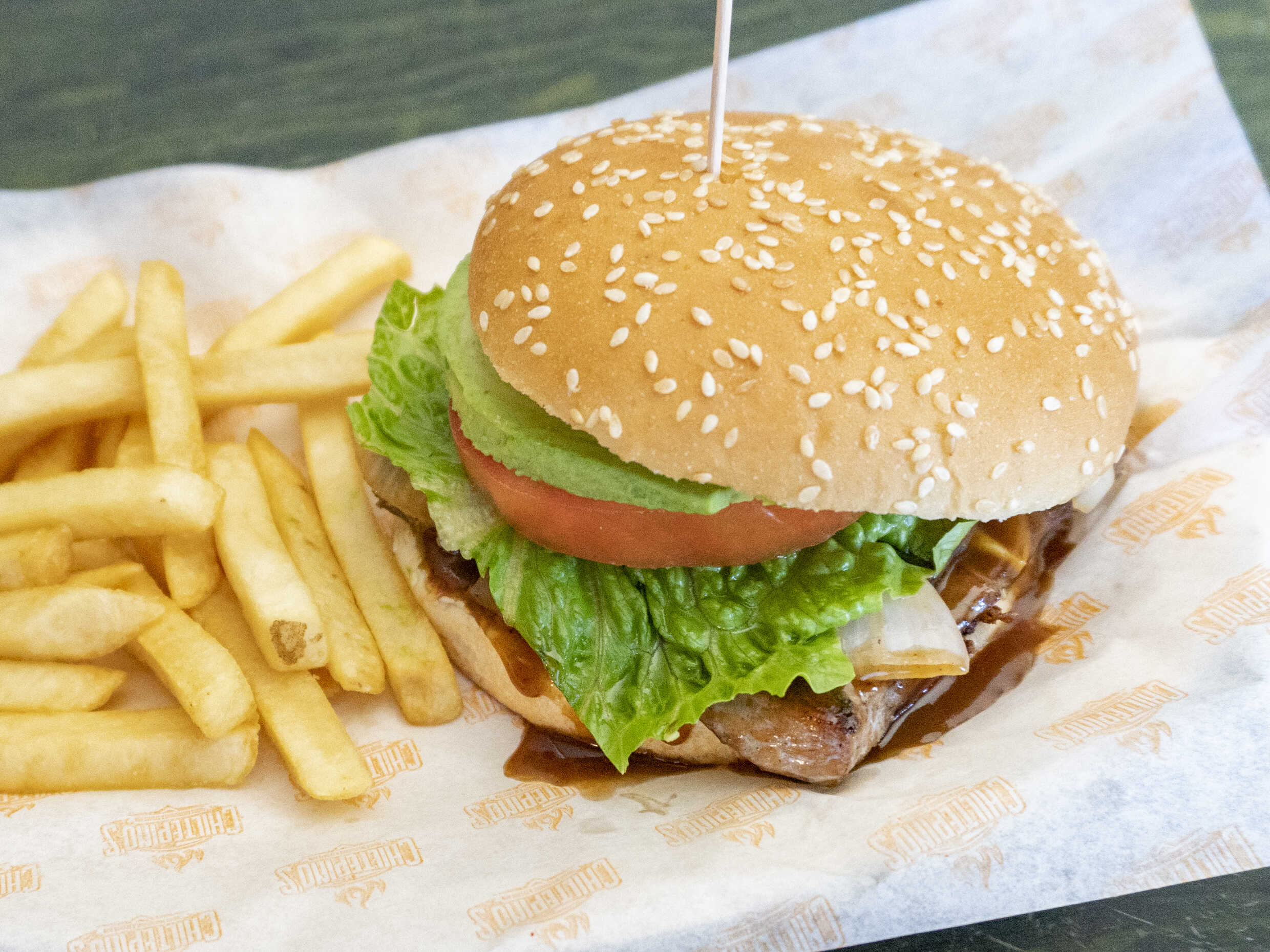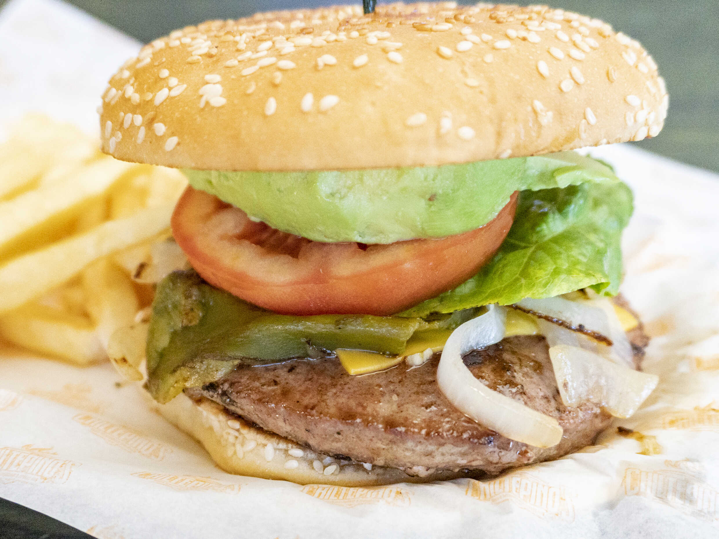 100 gramos de carne de res con queso y 170 gramos de papas a la francesa