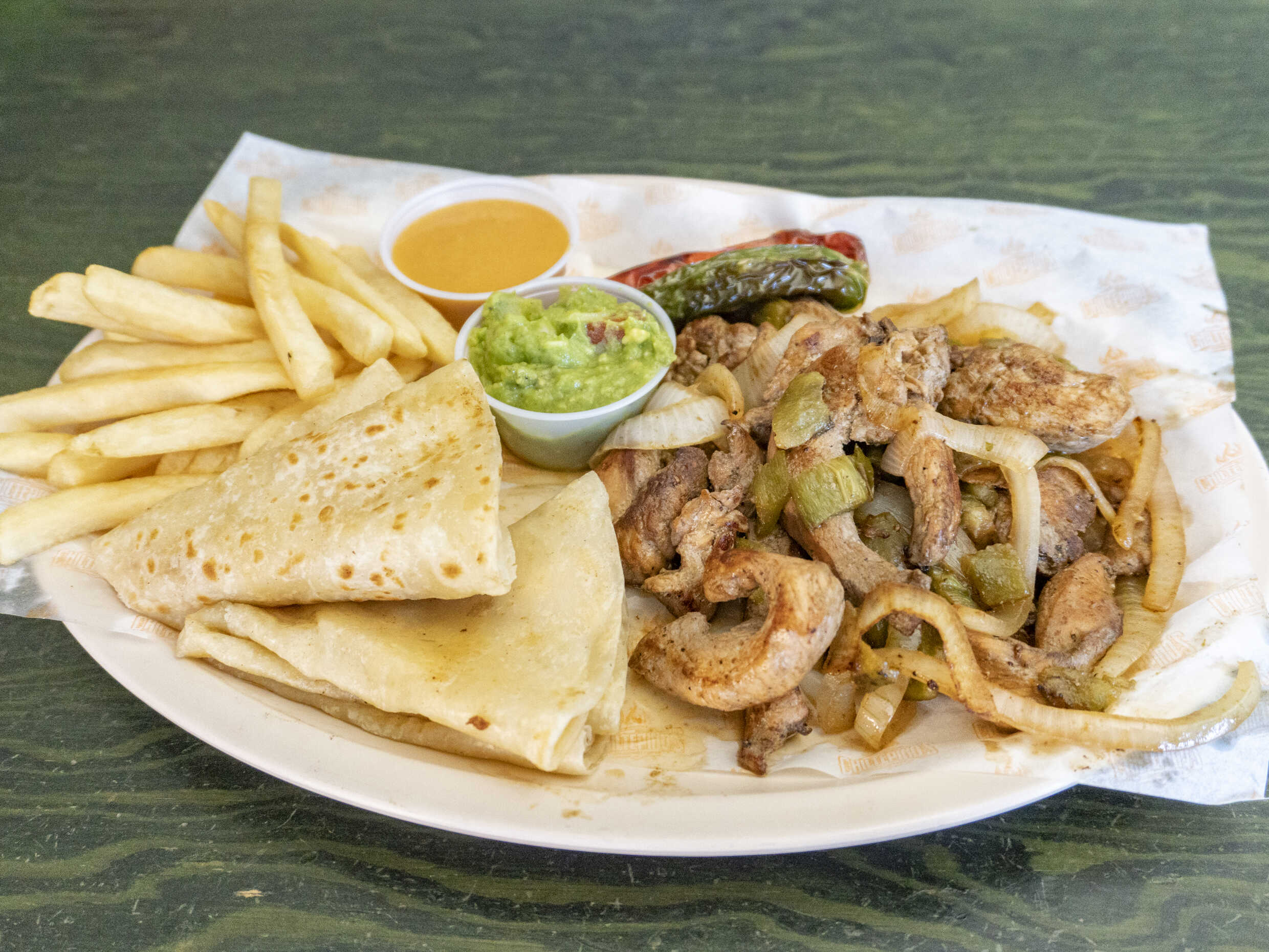 250 gramos de pechuga de pollo guisada en tiras a la plancha, con pimiento morron, chile verde y cebolla, acompañada de guacamole, papas a la francesa y tortillas de harina