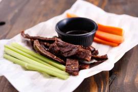 125 gramos de deliciosa carne seca de res fileteada, con chiltepin y acompañada de 2 oz de salsa negra con tiras de zanahoria y apio