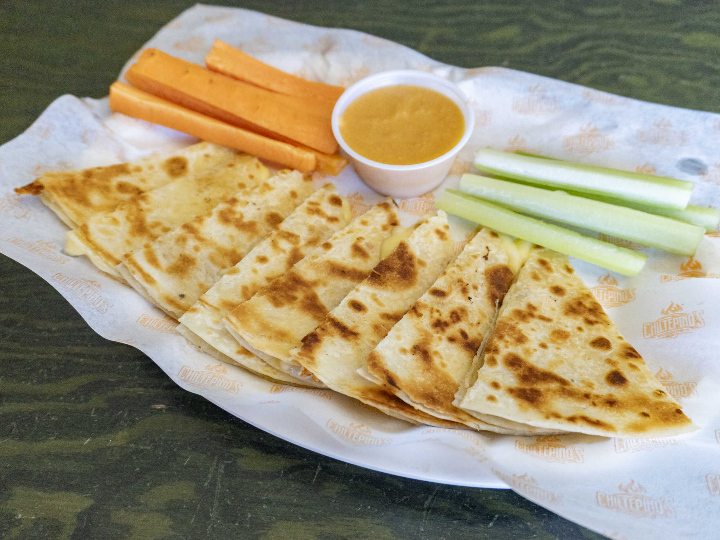 Doble tortilla de harina con mezcla de 4 quesos, con cebolla guisada y chile verde tatemado y 150 gramos de arrachera de res acompañado de salsa tatemada y tiras de apio y zanahoria