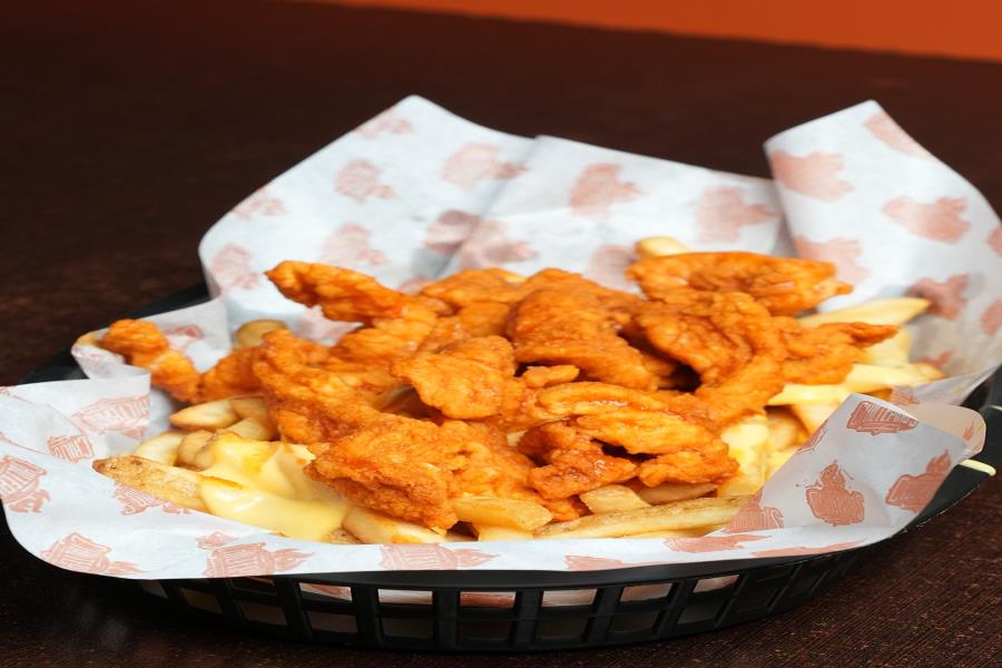 BONELESS (170 GR) SERVIDOS SOBRE UNA CAMA DE PAPAS FRANCESAS (340 GR), BAÑADOS EN QUESO CHEDDAR (4 OZ) Y LA SALSA DE TU ELECCION.