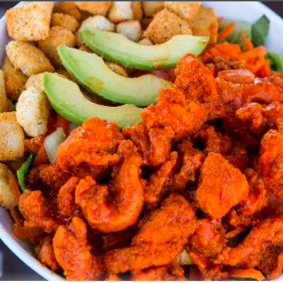 "Cama de lechuga fresca, tomate, aguacate, pepino, zanahoria, crotones y 170 gr de tiras de pollo empanizadas bañadas en la salsa de tu elección."