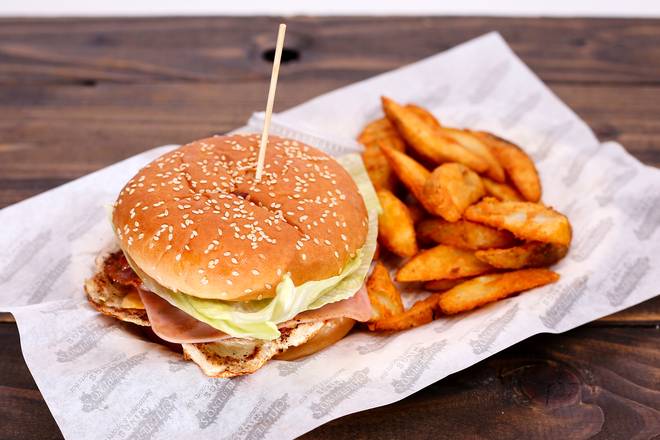 200 gr de 100% carne de res con queso amarillo, tomate, lechuga y aguacate. Con aros de cebolla, papas a la francesa ó sazonadas.