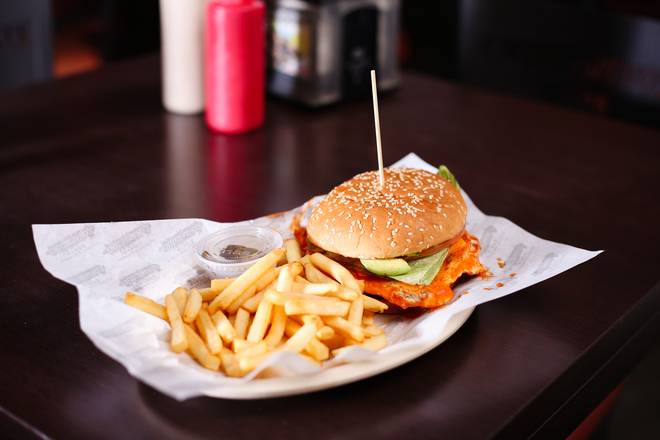 170 gr de pechuga de pollo a la plancha bañada en la salsa de tu elección, queso amarillo, tomate, lechuga y aguacate. (con aros de cebolla, papas a la francesa ó sazonadas)